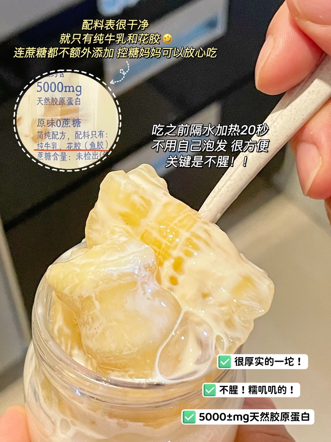 ✔️配料表也很干净,甄选大块花胶➕纯牛乳