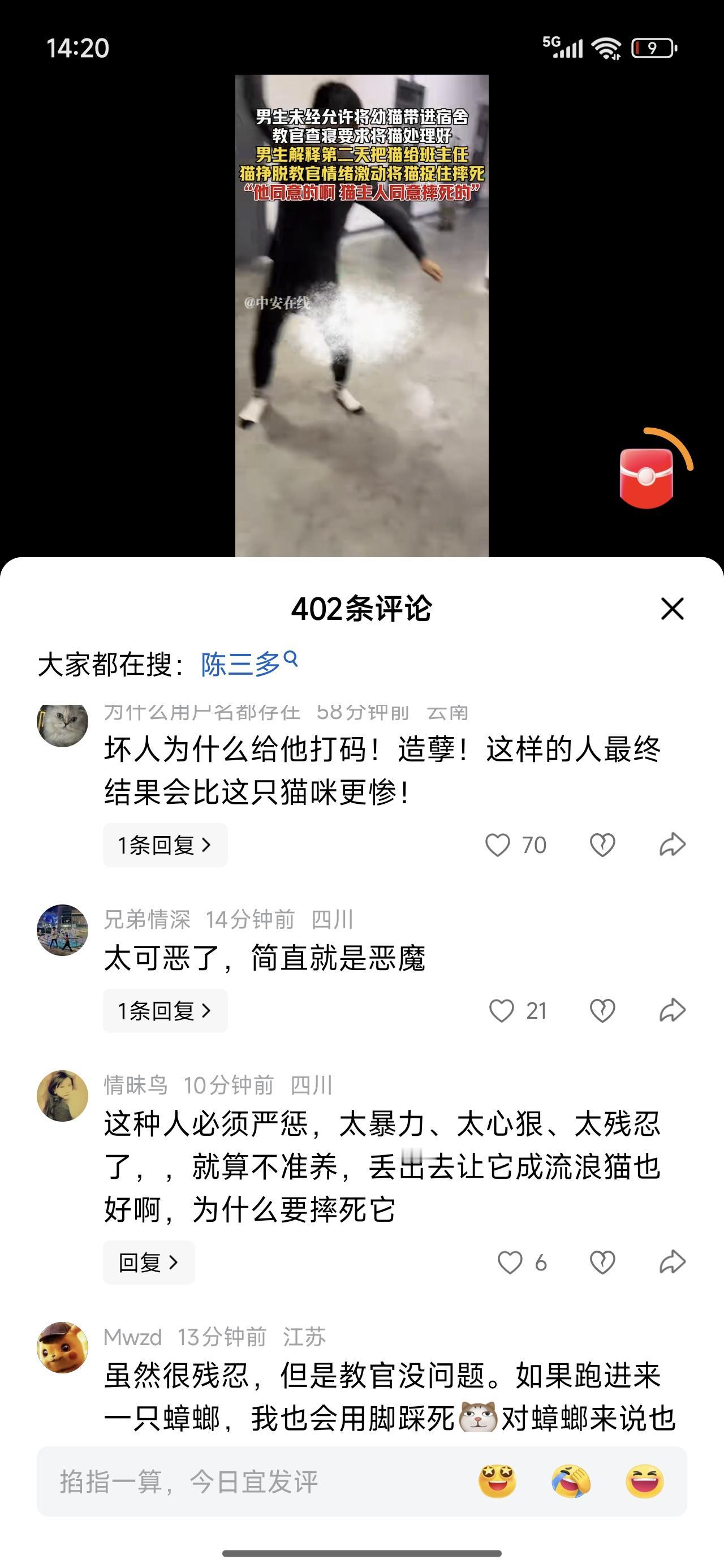 学生带猫进宿舍,教官给摔死了!每次看这种视频都胆战心惊。摔猫,摔了好几下猫才死。每次提起来再摔,猫都在蜷缩着身体。 太残忍了!孩子说了第二天教给班主任。或者送出去给谁也好。一个小猫,错的是学生,不是猫本身。太过分了!