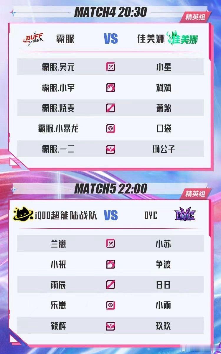 20:30 霸服 vs 佳美娜 22:00 iQOO超能陆战队 vs DYC