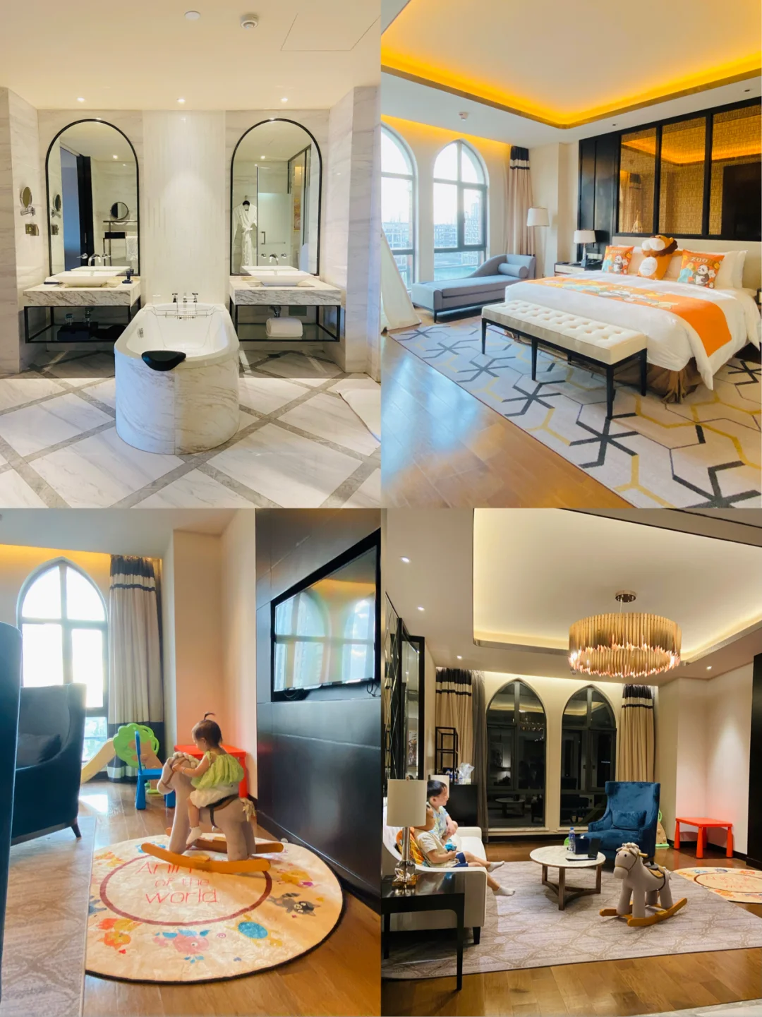 【住】我们住的是亲子主题大床套房,房费是986元,我们家是2大2小很宽敞,它是一个大套间。面积40多平米,有一张2.0米的特大床,还有两个沙发,两个卫生间,客厅有儿童玩具桌,滑滑梯,摇摇木马。房间里我们最惊喜的就是超大的沐浴间,正中间有堆满玩具的大浴缸🛁,玩具小喷头,发条小乌龟🐢,发条小飞机小水枪🔫等,简直就是迷你版的水上乐园[偷笑R]