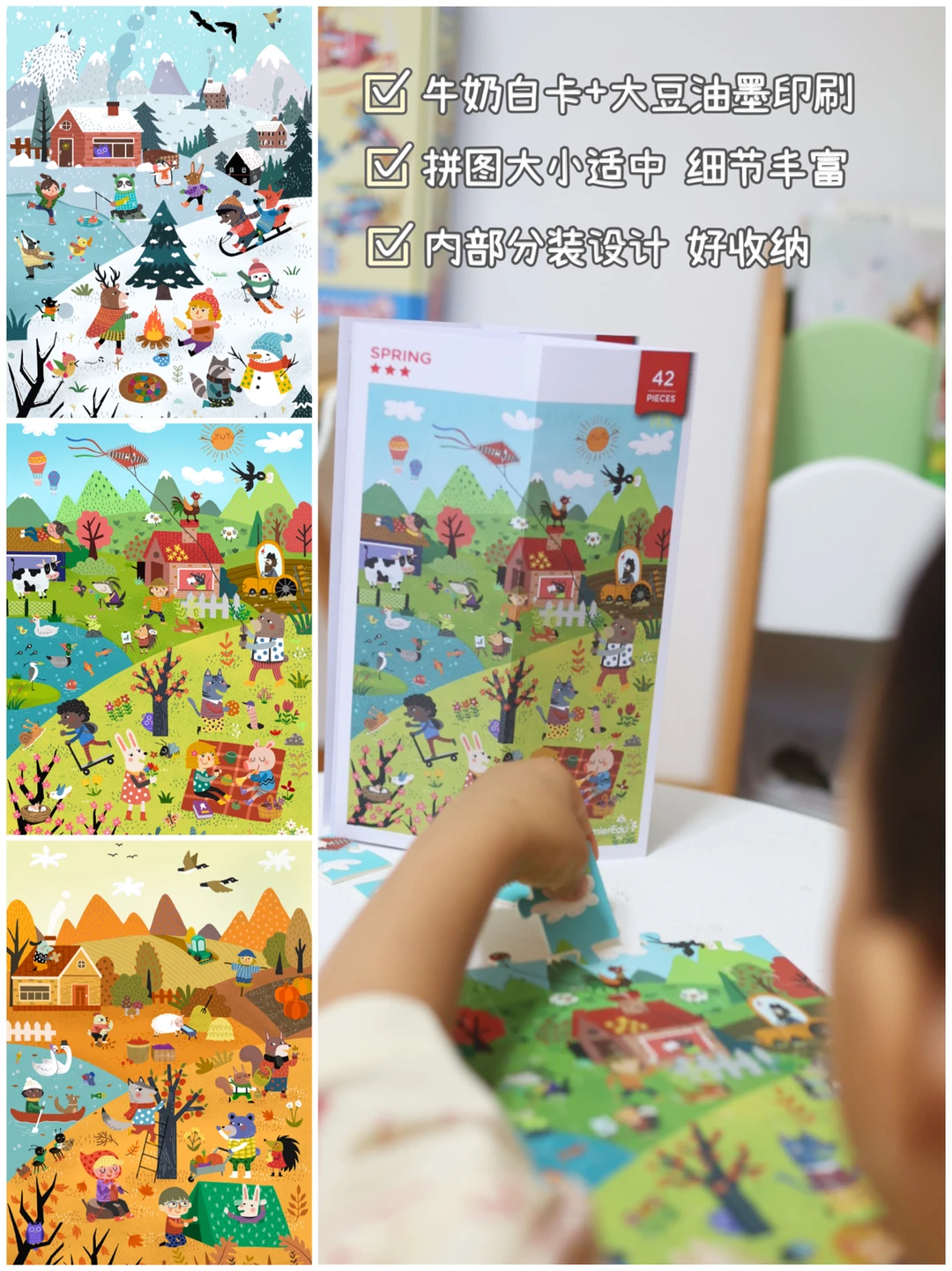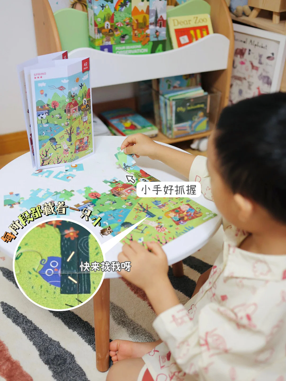 这款拼图是无du大豆油墨印刷,宝宝玩起来完全放心。这个拼图是成长拼图🧩也就是根据咱们不同的年龄可以对应不同的难度的,zui开始可以从基础的两三块的开始玩,慢慢增加难度。可以带着孩子了解不同的知识、动植物,而且每个图纸的后面都有详细的讲解,宝宝的不懂的话,看看讲解就能知道个大概,宝宝很喜欢玩,玩拼图不仅仅可以锻炼宝宝的专注力还可以锻炼宝宝独立整理的好习惯,现在他的小卧室都会像拼拼图一样整齐的摆好呢!