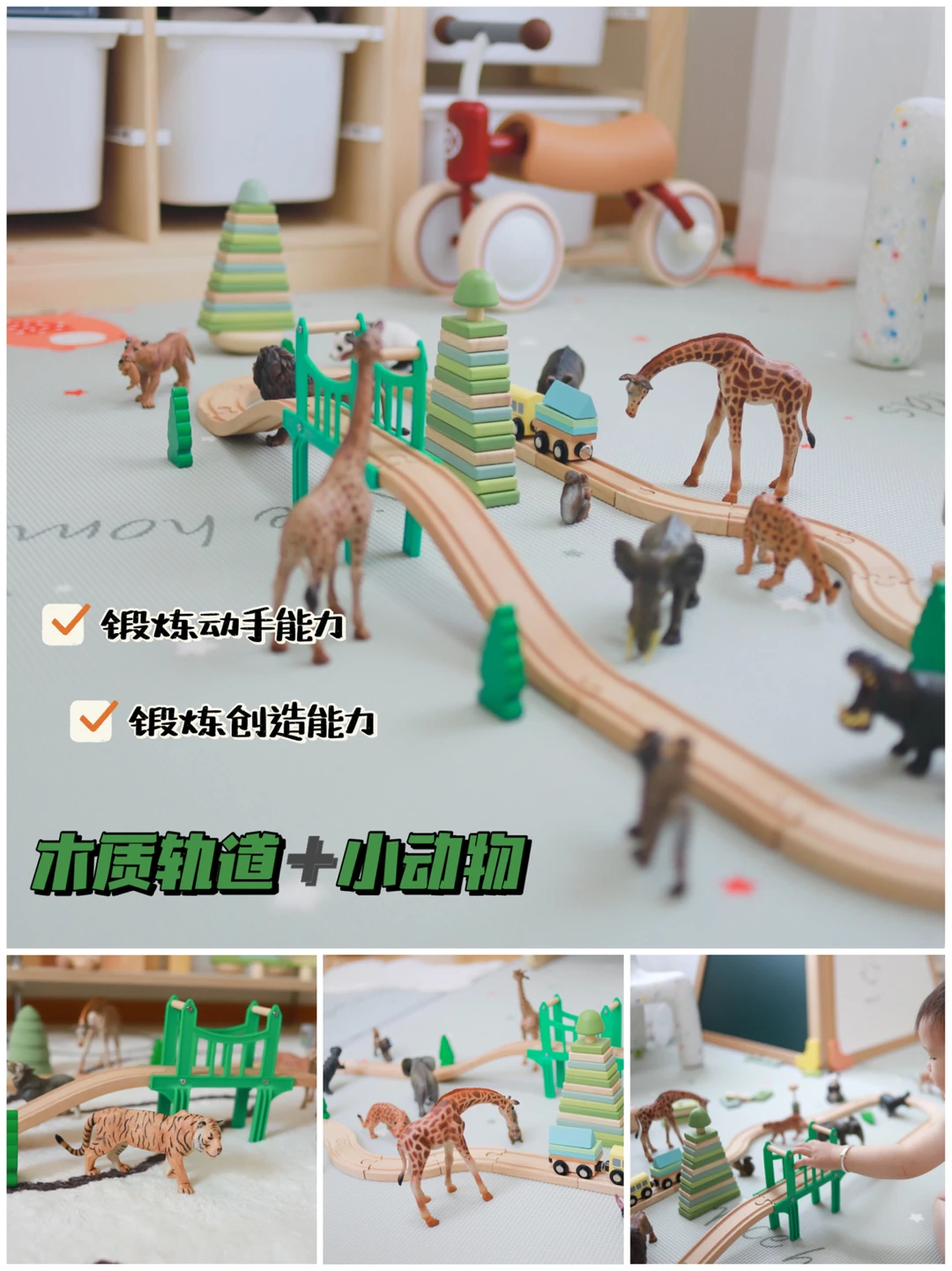 实体店入的木质轨道加上1688入的仿真小动物,组成了我们家的一个小小动物园。拼铁轨可以锻炼他们的动手能力还有创造力,小动物可以带宝宝做早教认识各种小动物