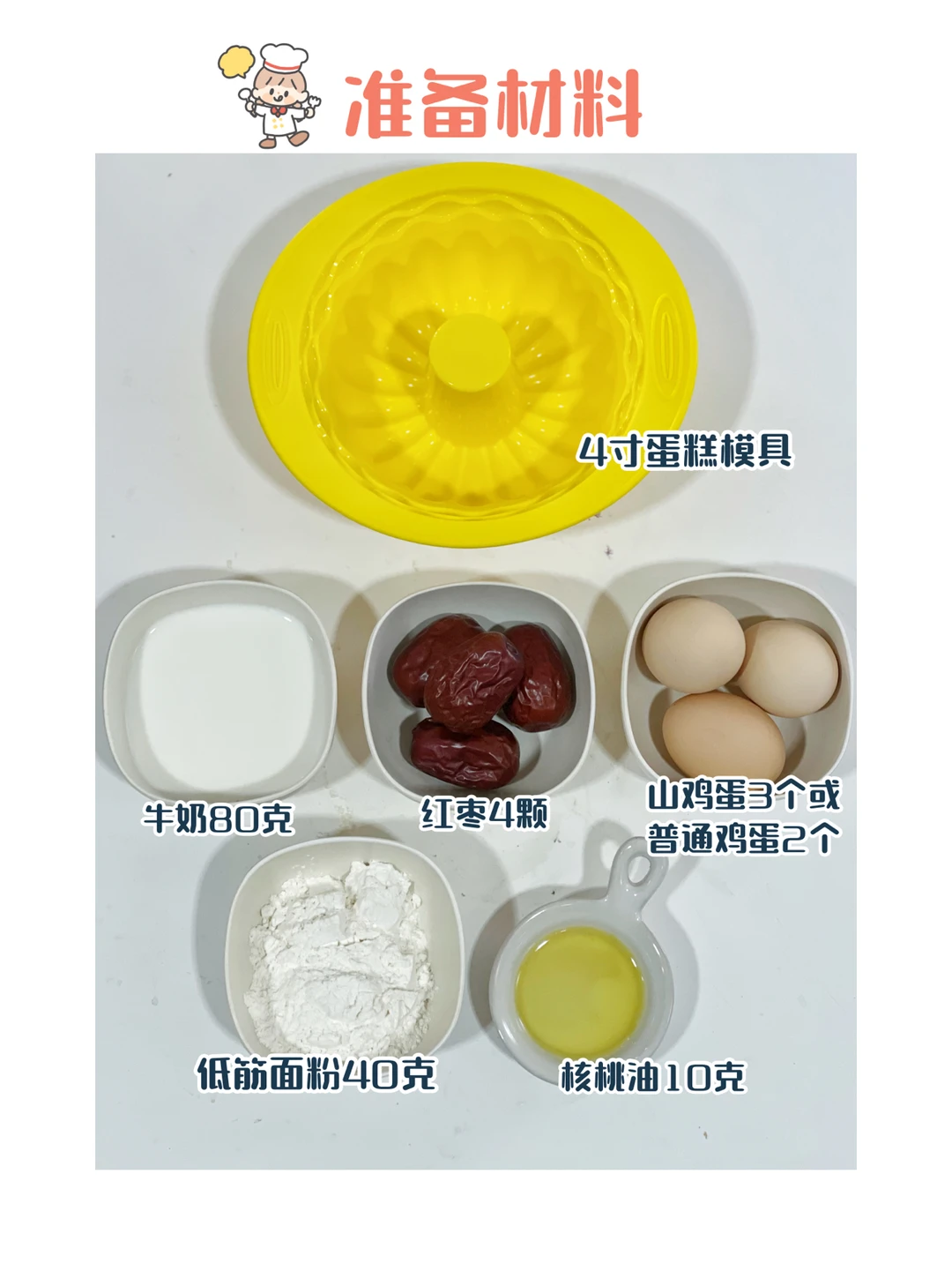 🎀准备材料:红枣4颗,牛奶80克,山鸡蛋3个(普通鸡蛋2个),低筋面粉40克,核桃油10克,4寸蛋糕模具。