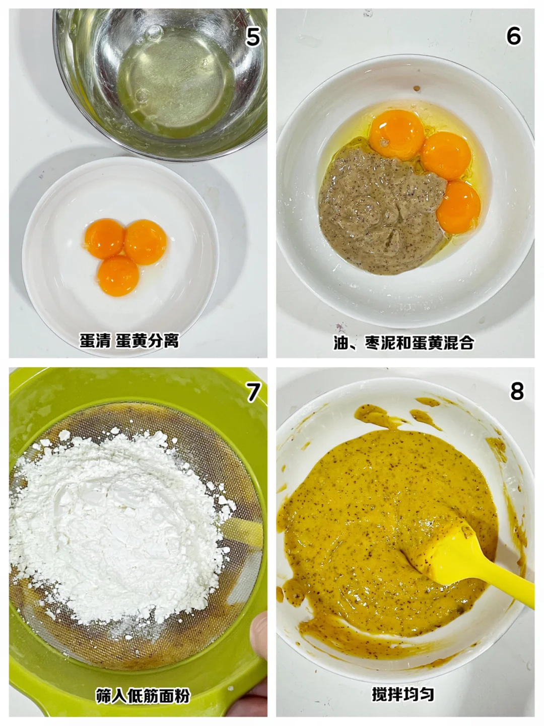🔹蛋黄和蛋清分离,蛋黄里加入枣泥、油拌匀,再筛入低筋面粉搅拌均匀。