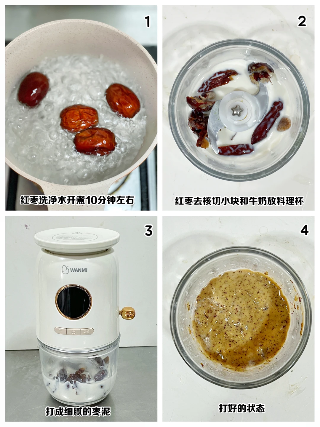 🔹红枣水开煮10分钟,红枣去核切小块和牛奶一起放料理杯打成细腻的枣泥(这个料理机还可以承重哦)