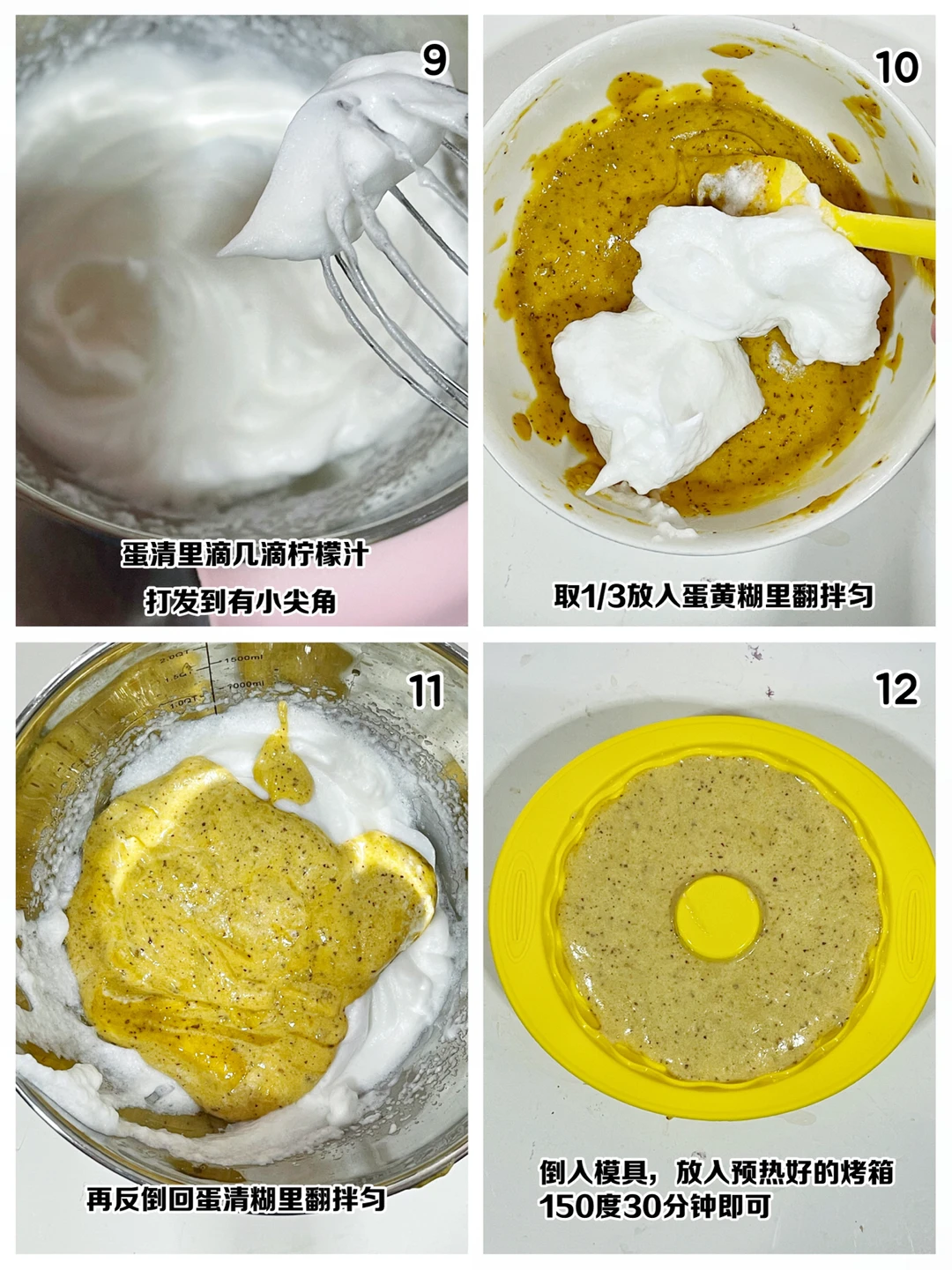 🔹蛋清里滴入几滴柠檬汁,打蛋器打发到有小尖角,取1/3放入蛋黄糊里翻拌均匀,再翻倒回蛋清糊里翻拌均匀。放入预热好的烤箱,150度烘烤30分钟就可以啦。