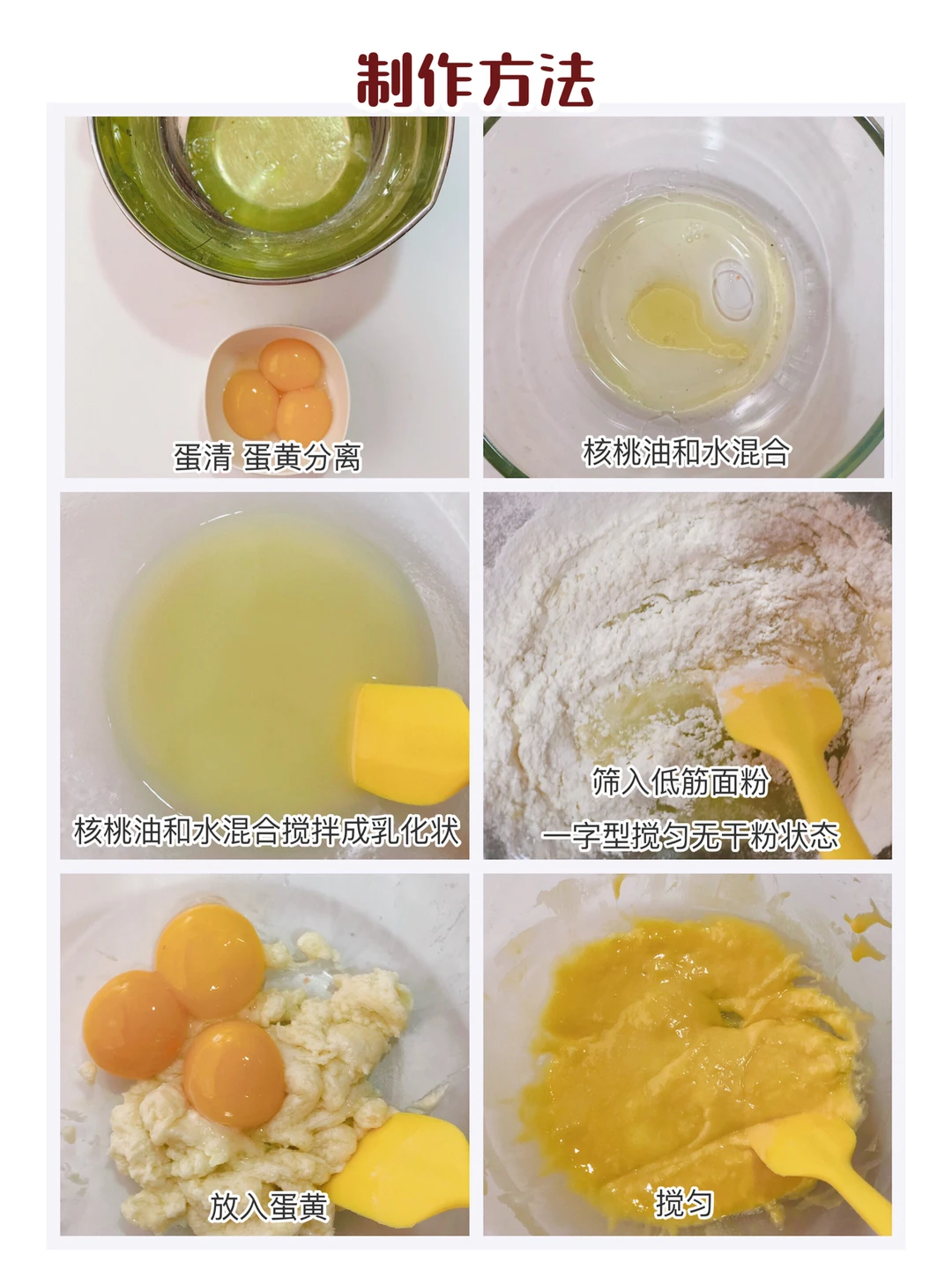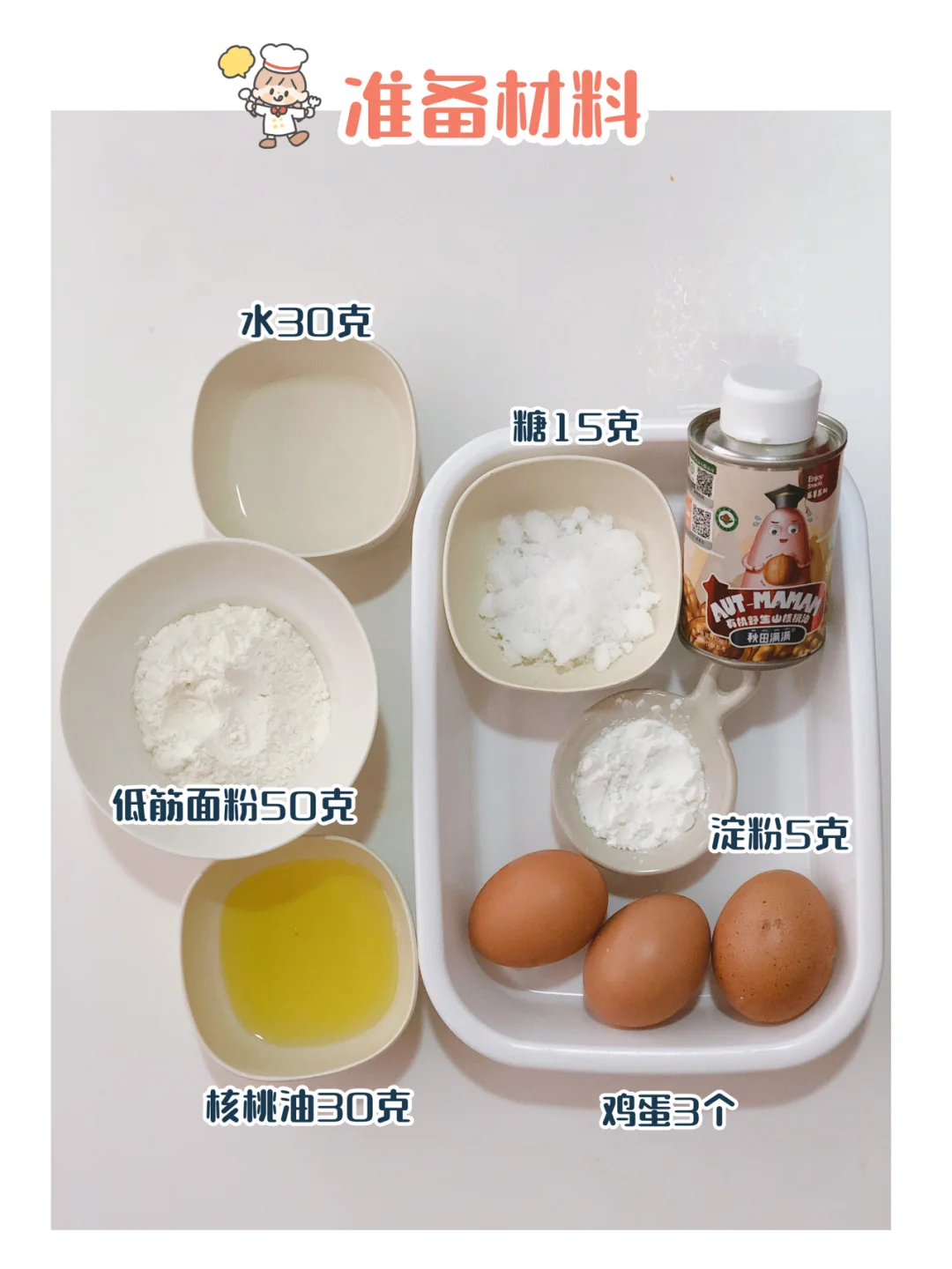 🎀准备材料:鸡蛋3个,核桃油30克,低筋面粉50克,水30克,糖15克,淀粉5克。