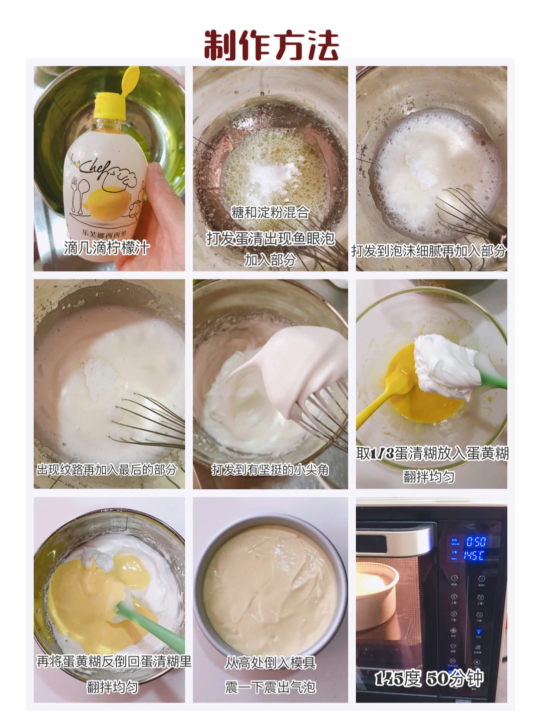 4️⃣取1/3蛋清糊放到蛋黄糊里,翻版均匀,再反倒回蛋清糊里翻版均匀。倒入6寸模具,震几下震出气泡,放入烤箱145度50分钟即可。