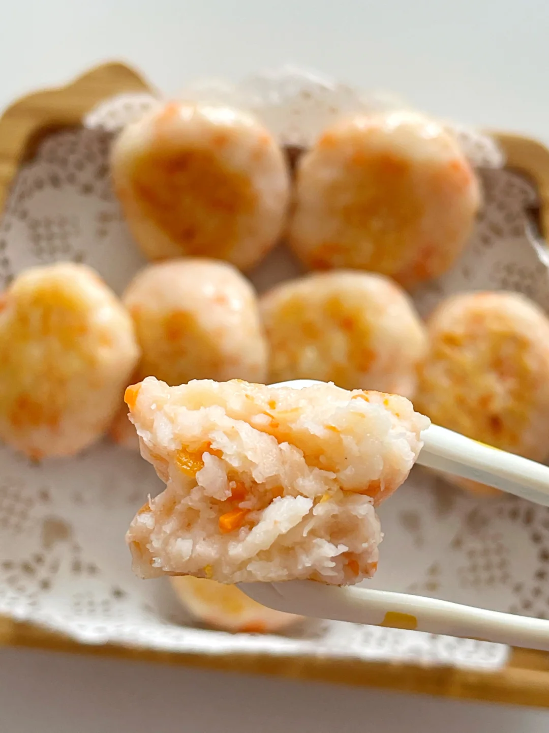 🔹把山药泥、虾泥、胡萝卜再加一勺淀粉搅匀。