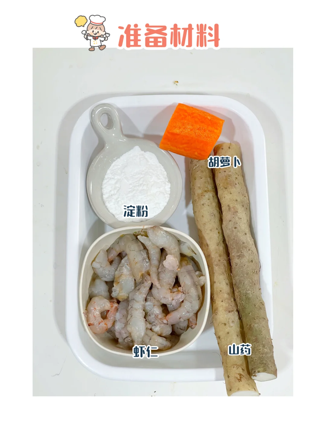 ✅准备材料:铁棍山药、虾仁、胡萝卜、淀粉。