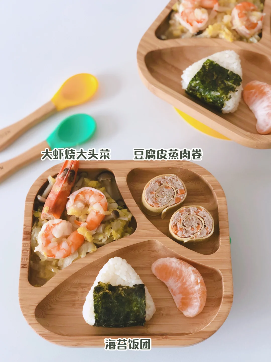 🎀周一:豆腐皮蒸肉卷/大虾烧大头菜/海苔饭团 🌟豆腐皮蒸肉卷:准备材料:豆腐皮、猪里脊、胡萝卜