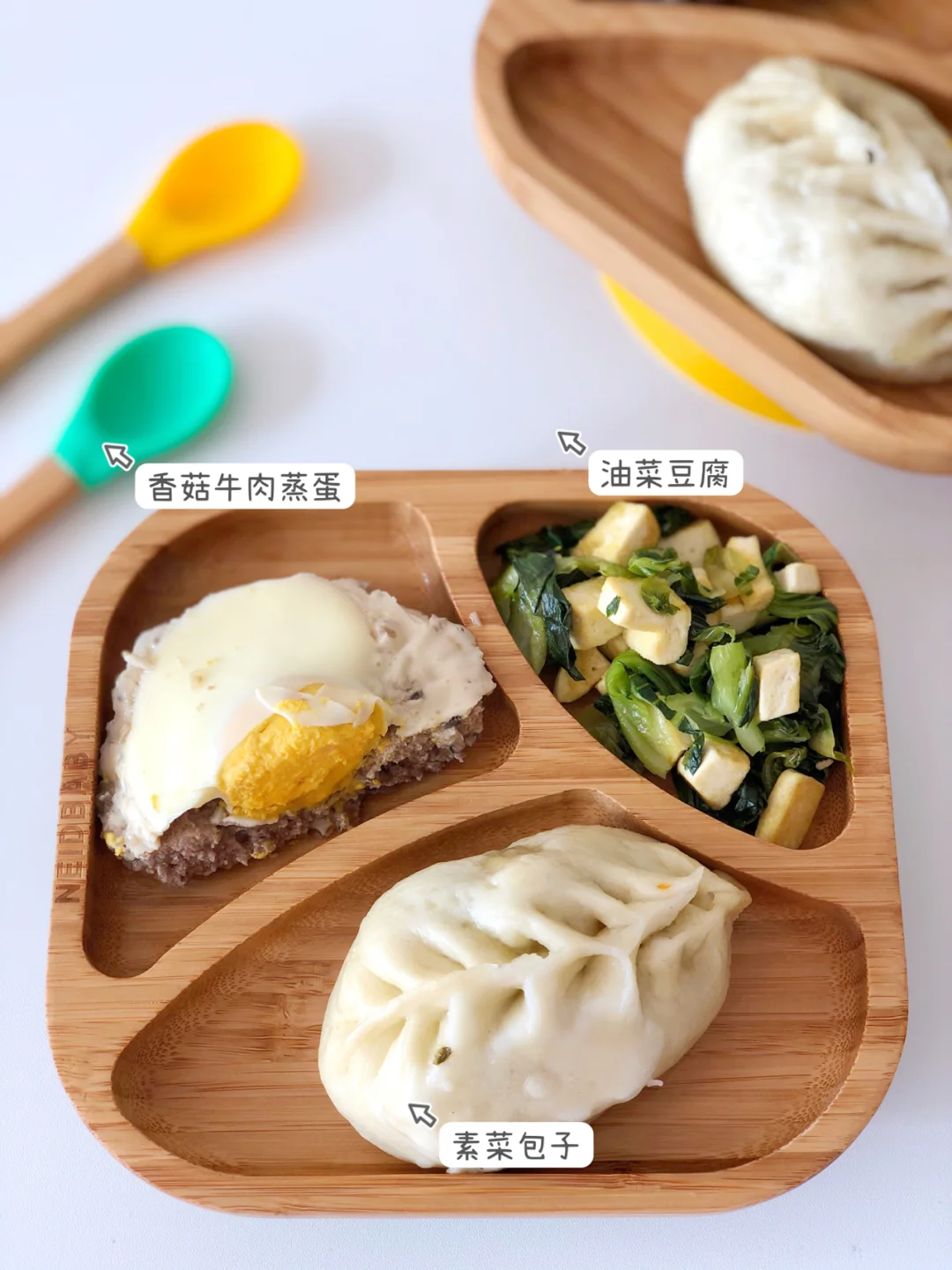 🎀周五:香菇牛肉蒸蛋、油菜炒豆腐、素菜包子