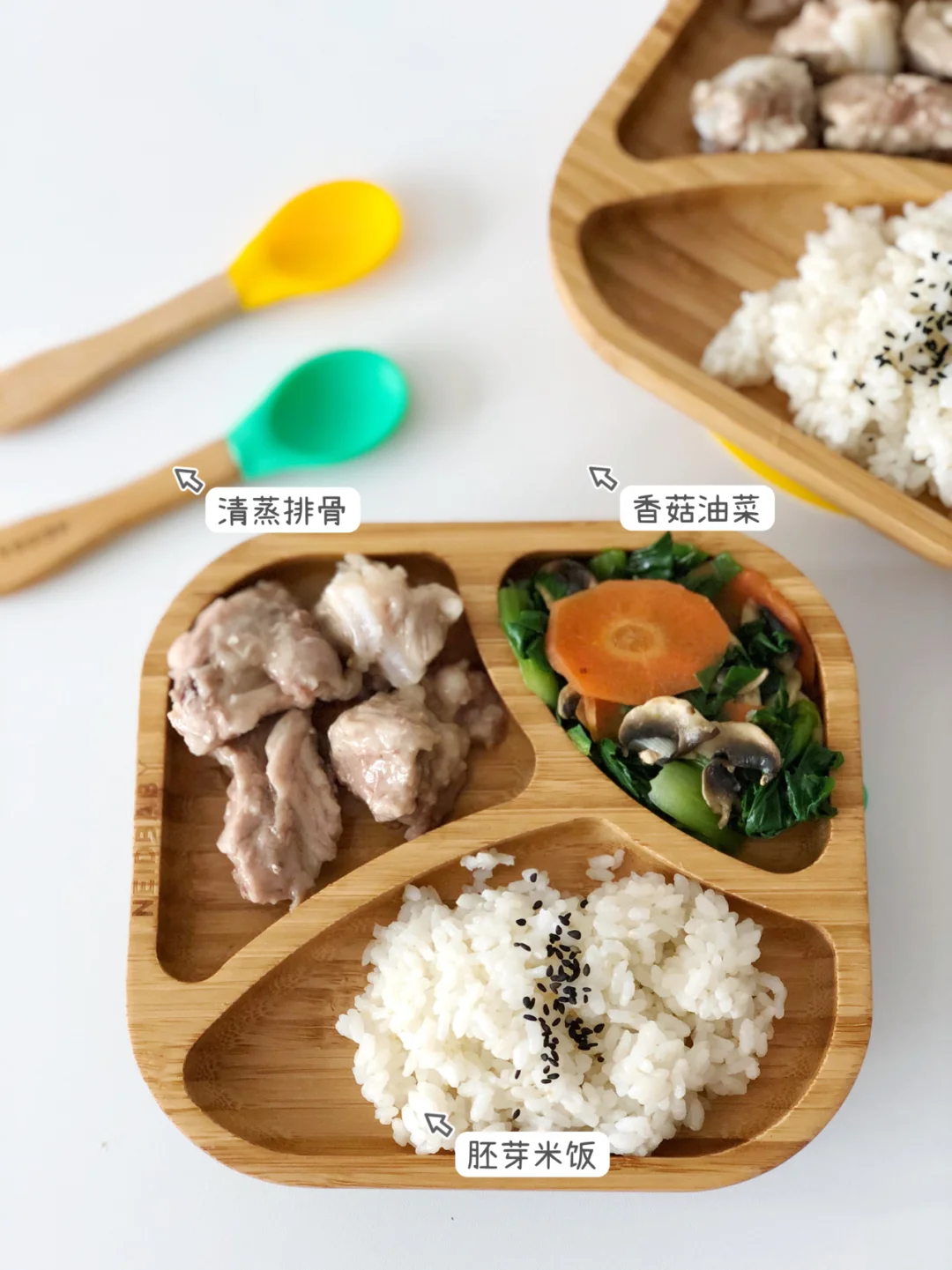 ✅清蒸排骨:排骨尽量切小块,洗净控干水。放姜片、葱段、蒜片,一勺宝宝酱油,一勺玉米淀粉,一勺辅食油拌匀腌制20分钟。冷水上锅蒸40分钟即可。