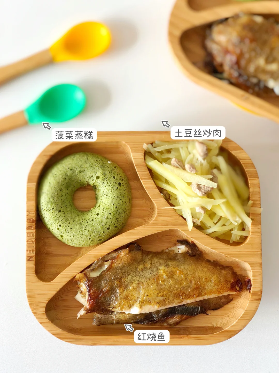 🎀周三:土豆丝炒肉、红烧鱼、菠菜蒸糕