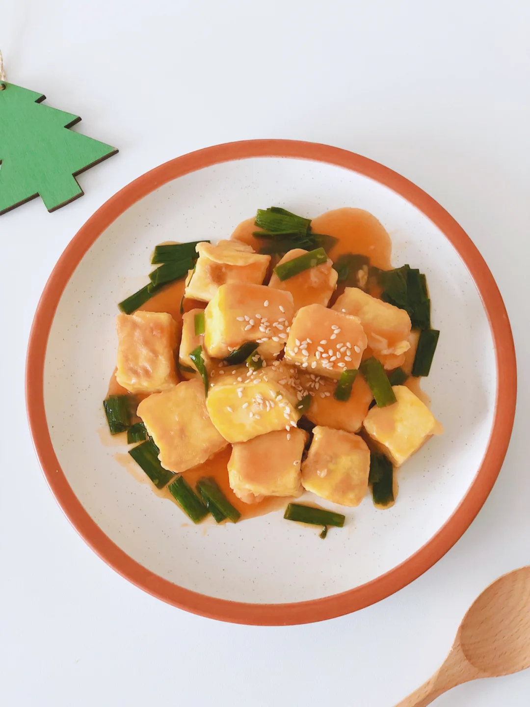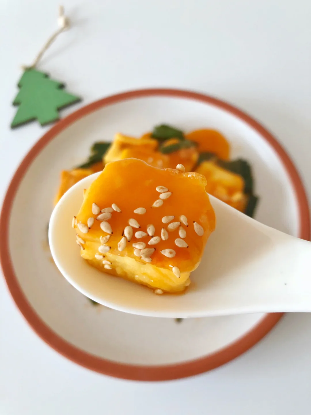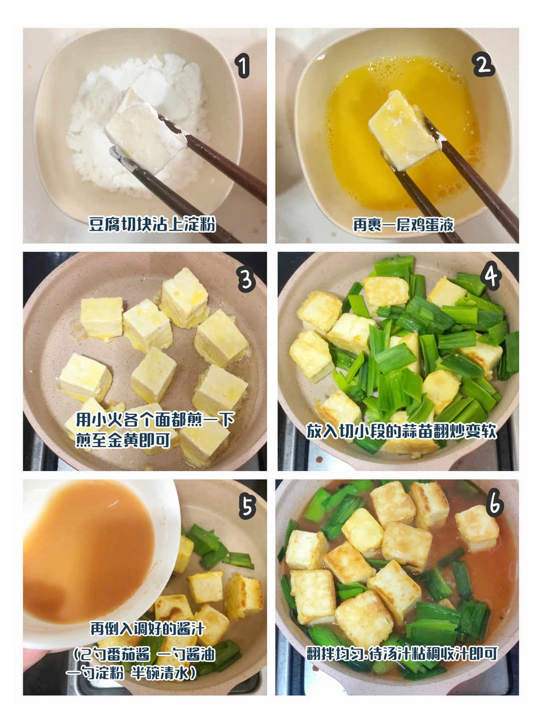 🔹豆腐丁先蘸取淀粉,再裹上蛋液,锅中油热后,放入豆腐,中小火各个面都煎一下,煎至金黄即可,再放入蒜苗翻炒变软(也可不加),倒入调好的酱汁,把豆腐翻拌均匀,待汤汁粘稠收汁即可。