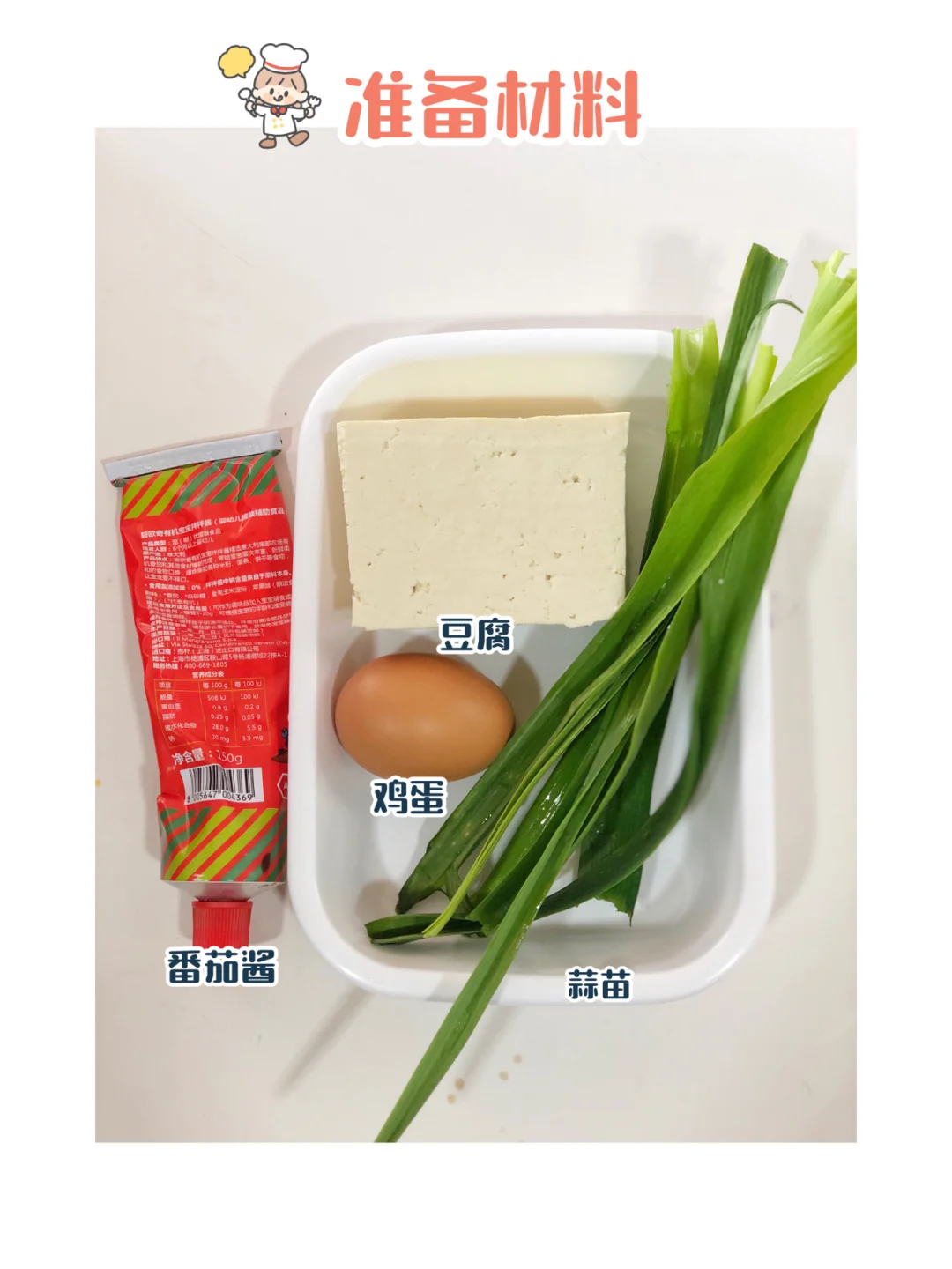 🎀准备食材:北豆腐、蒜苗、鸡蛋、番茄酱、酱油、淀粉。