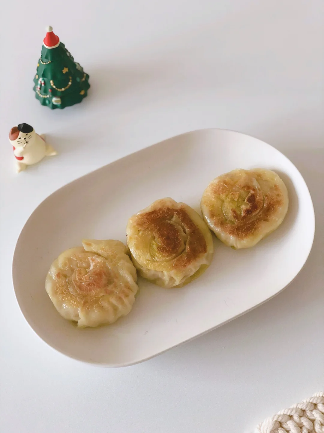 🔹把饺子皮都擀一下,擀大一点薄一些,选3张叠压在一起,在上面码上猪肉馅,卷成卷,再从一段卷成饼状,用手轻微压平一下。