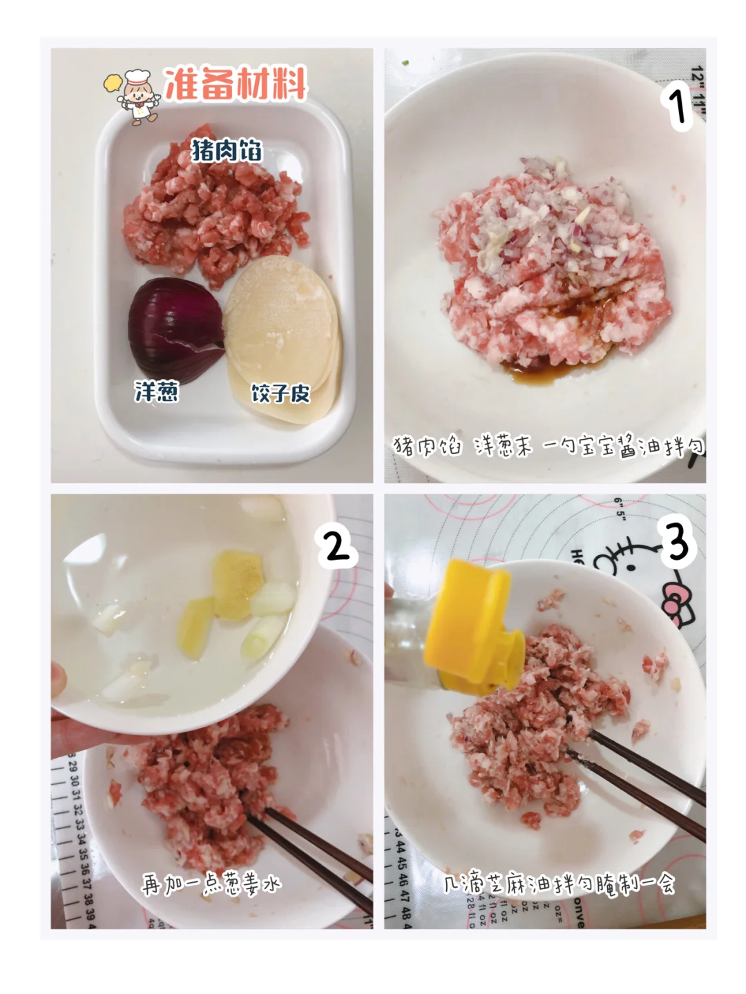 🎀准备材料:饺子皮、猪肉馅、洋葱。(肉也可以换里脊肉,牛肉)