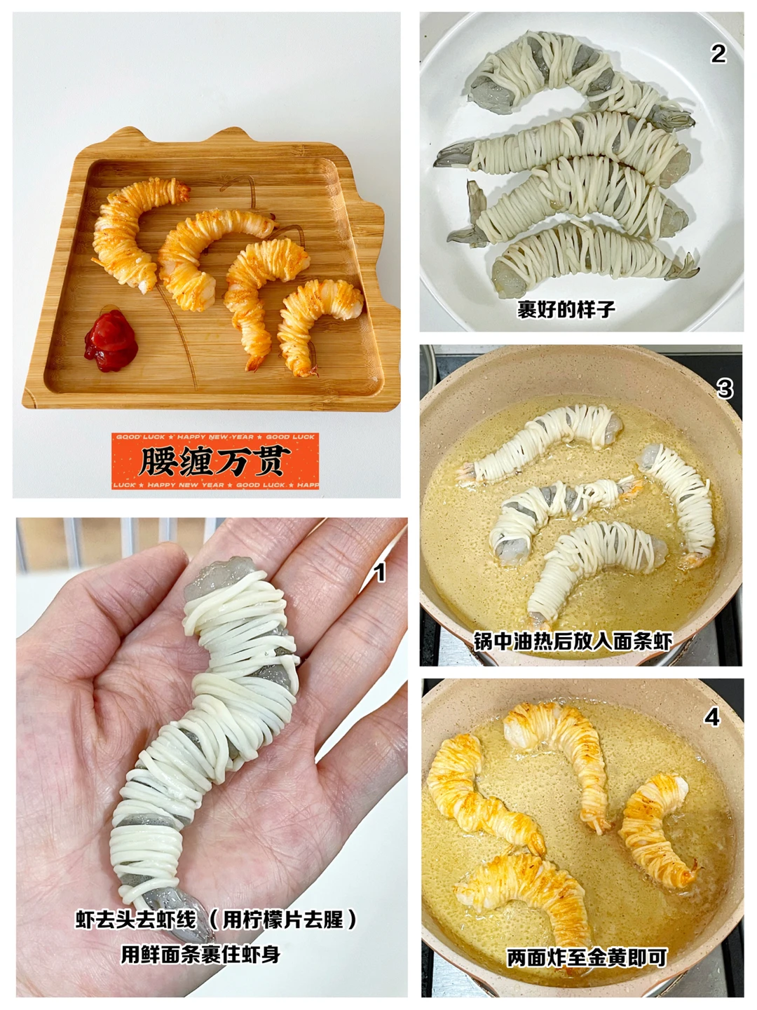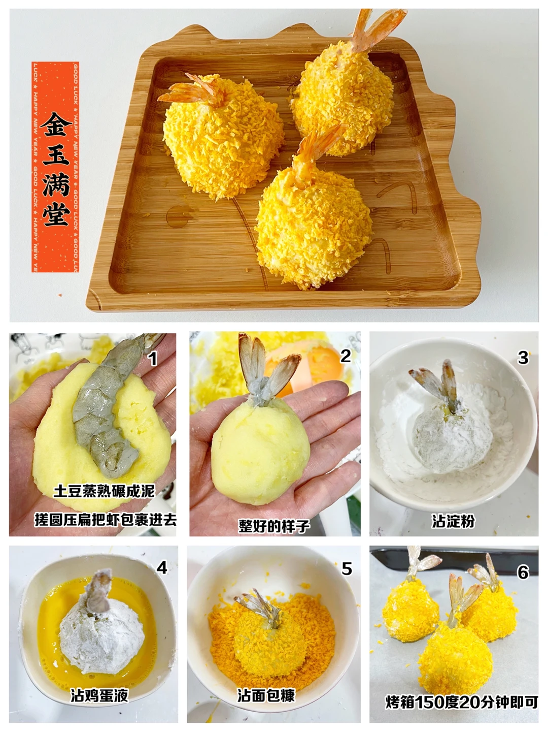 🔹取适量土豆泥包住虾仁,尾巴露在外面。依次沾淀粉、蛋液、面包糠。烤箱150度烘烤20分钟即可。