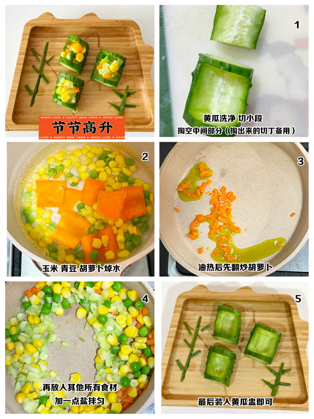 🔹锅中油热后,先翻炒胡萝卜,再放入剩下所有的食材,炒熟加一点盐拌匀,最后装入黄瓜盅即可。
