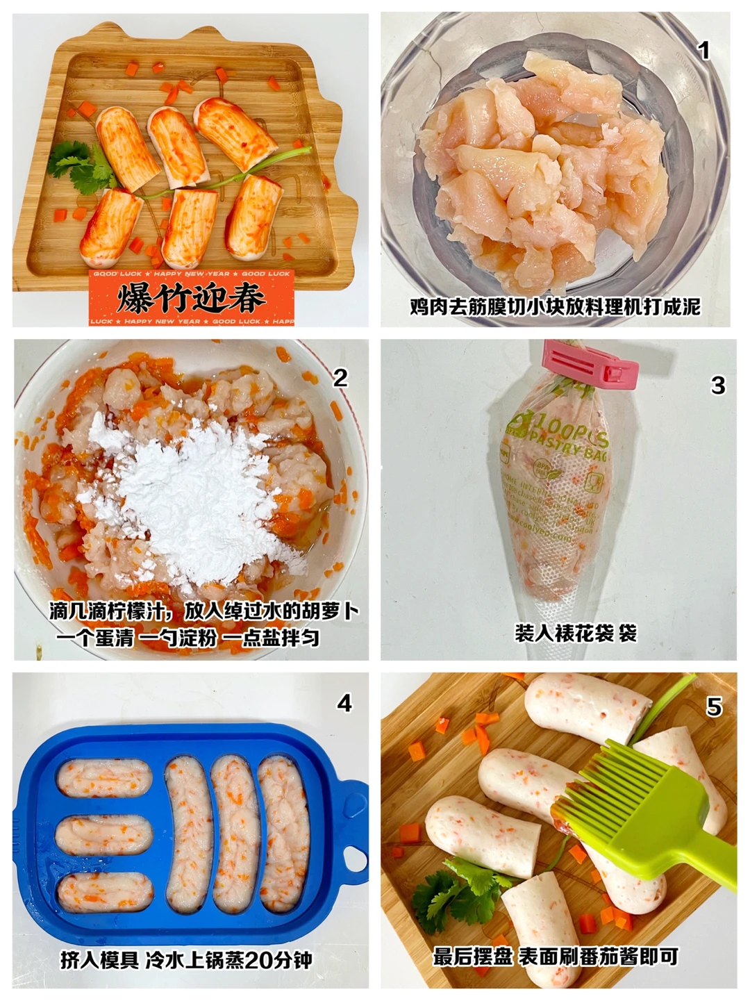 🔹鸡肉去筋膜切小块放料理机打成泥,再放入焯过水的胡萝卜末,加一个蛋清,一勺淀粉,一点盐顺时针拌匀,装入裱花袋,挤入香肠模具,冷水上锅蒸20分钟关火焖5分钟即可。
