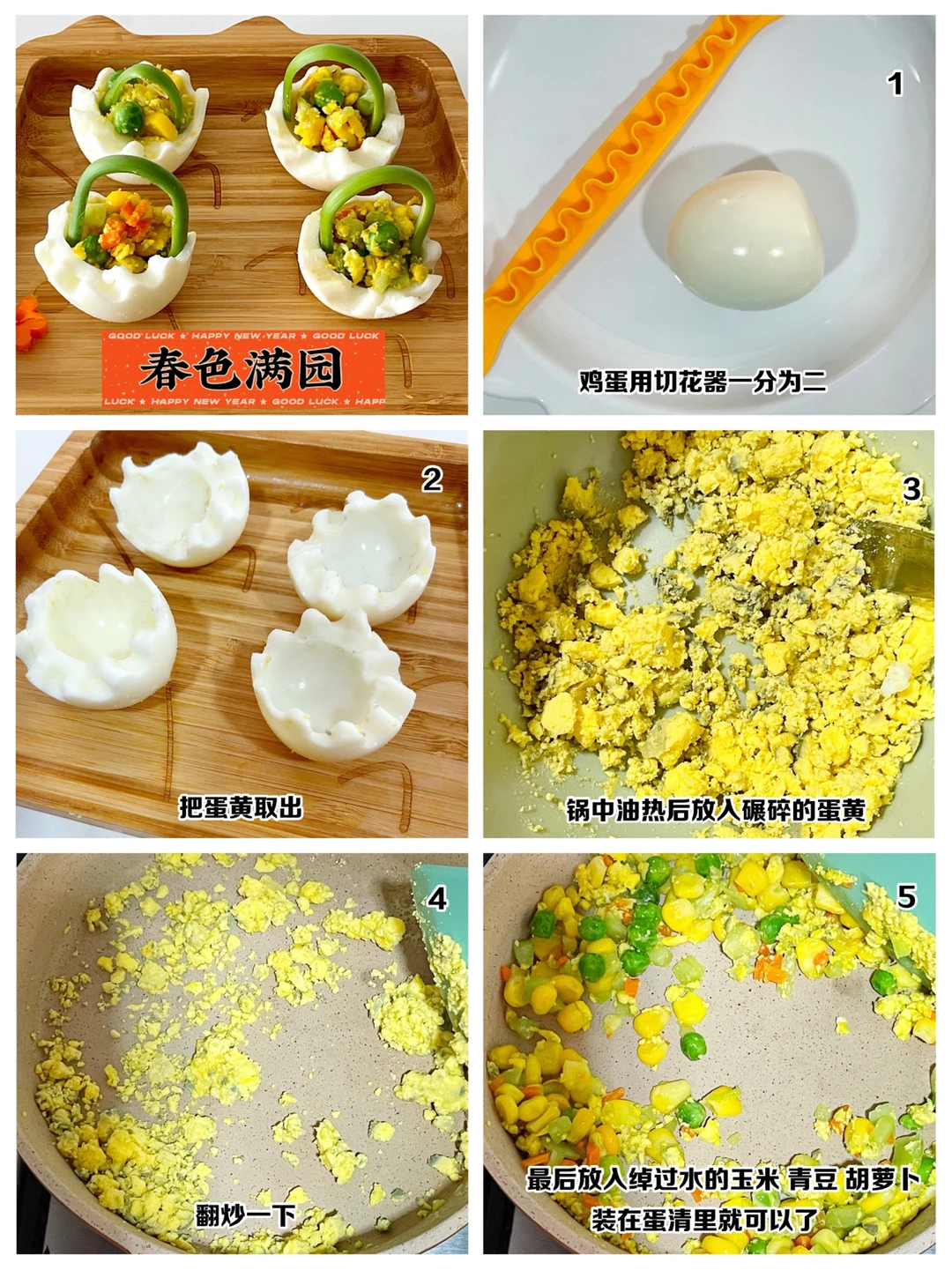 🔹蛋黄掏空碾碎。锅中油热后,放入蛋黄翻炒一下,再放入玉米、青豆和胡萝卜,加一点盐炒匀,装入蛋清里,再用蒜苔梗装饰花篮提手即可。