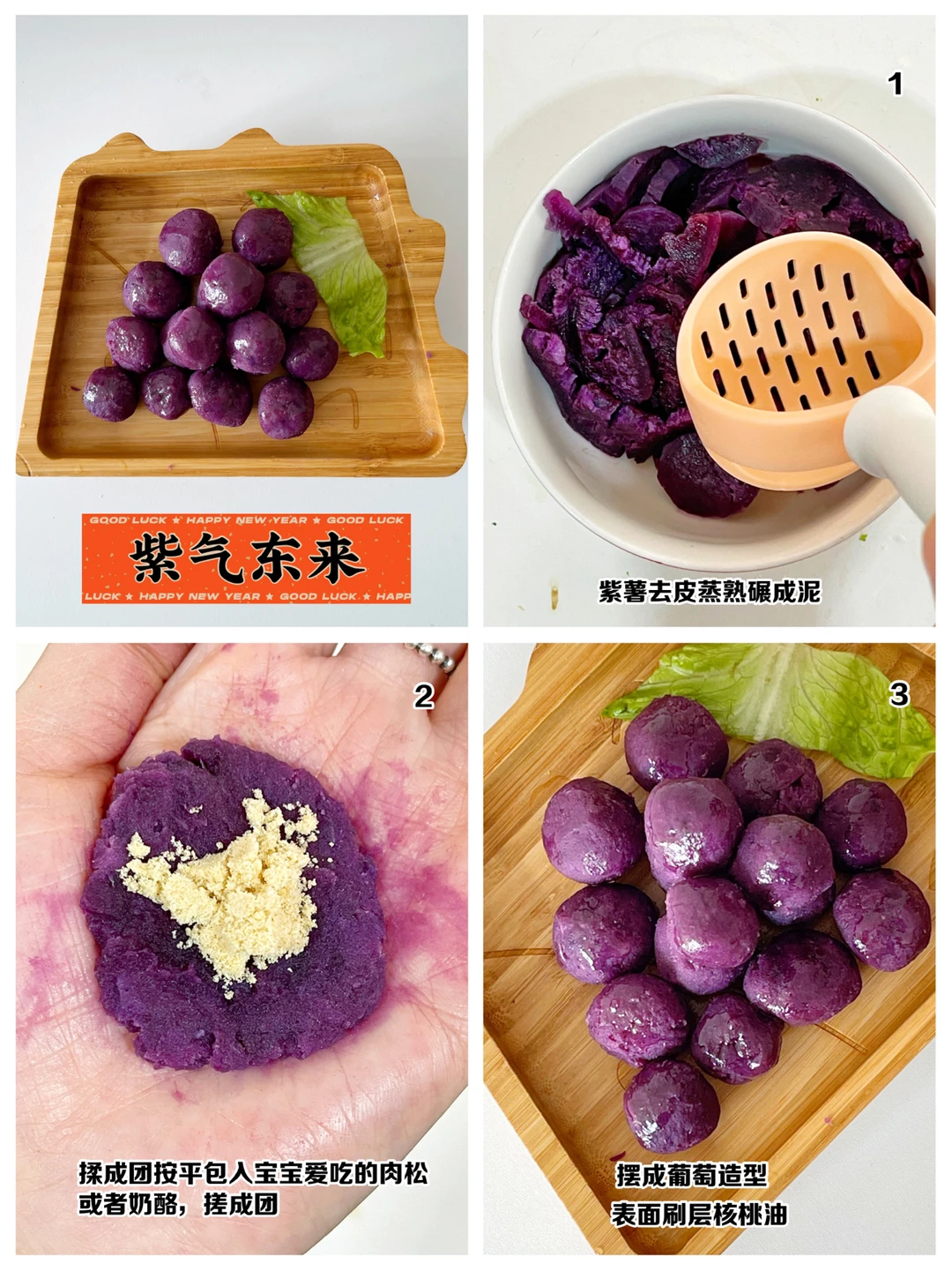 紫薯去皮上锅蒸熟,碾成泥,取适量紫薯泥,包入肉松(奶酪也可以)搓成团,装饰成葡萄的样子,表面刷核桃油即可。