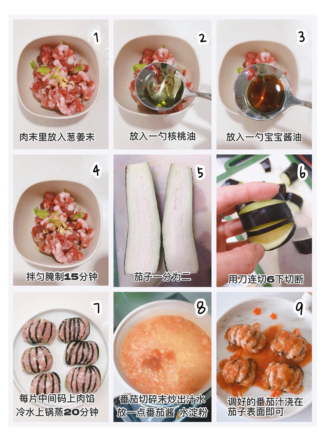 🔹茄子洗净,从中间一切为二,再用刀连切6下切断(中间切的时候不要太使劲,以免切断),每片的中间码上腌制好的肉馅,放盘中冷水上锅蒸20分钟。