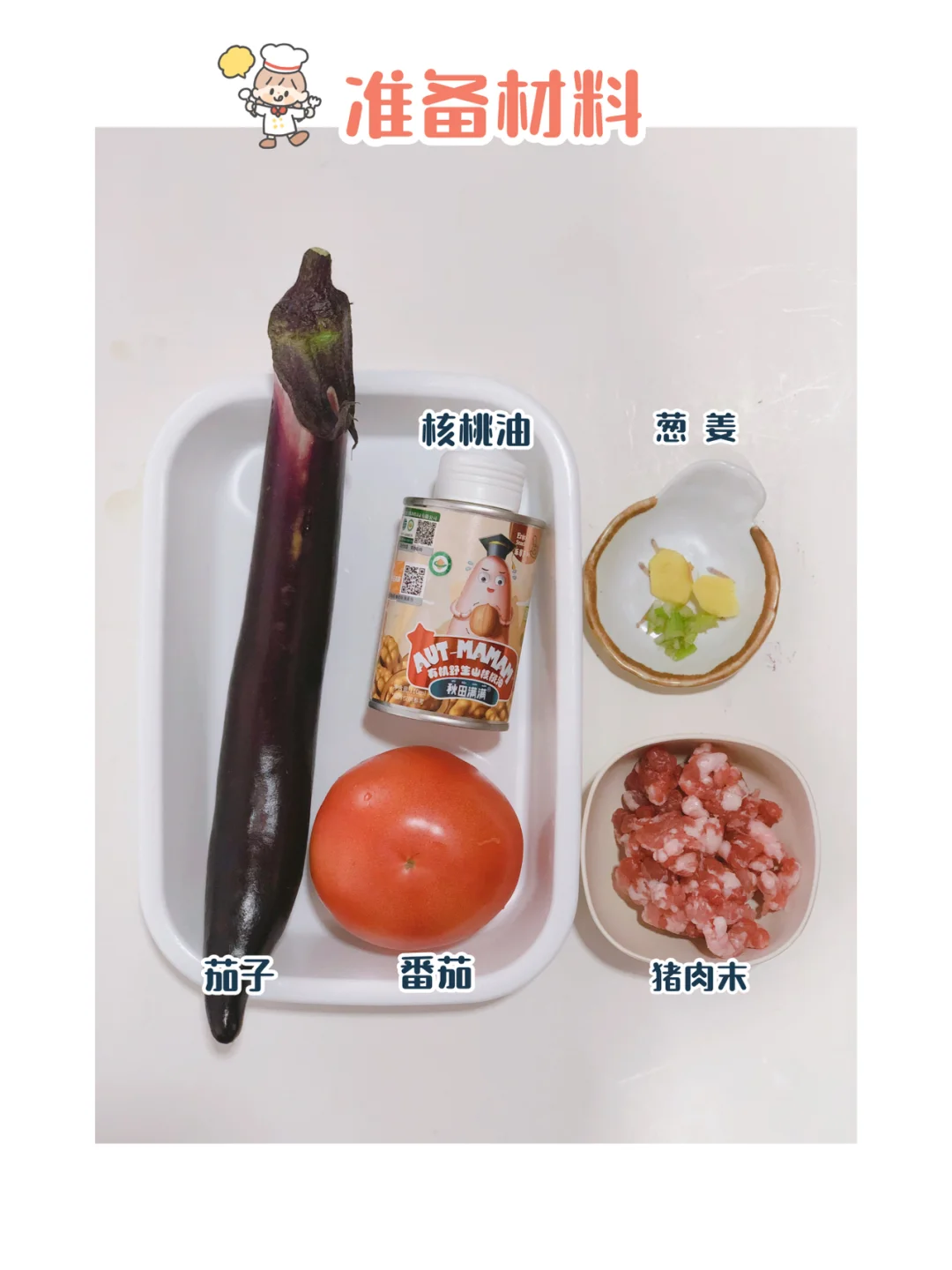 🎀准备材料:茄子、猪肉末、番茄、核桃油、葱、姜。