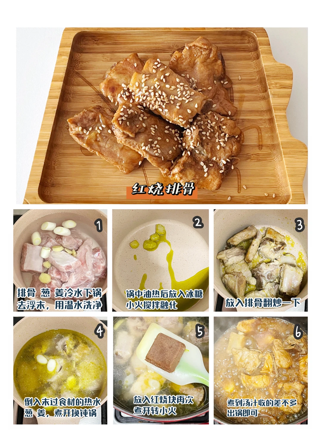 🔹锅中油热后放入几块冰糖,小火搅拌融化,放入排骨翻炒一下,倒入适量的热水,煮开转小火,放入红烧块搅拌融化,开大火再次煮开转小火炖煮,煮到汤汁收的差不多即可.