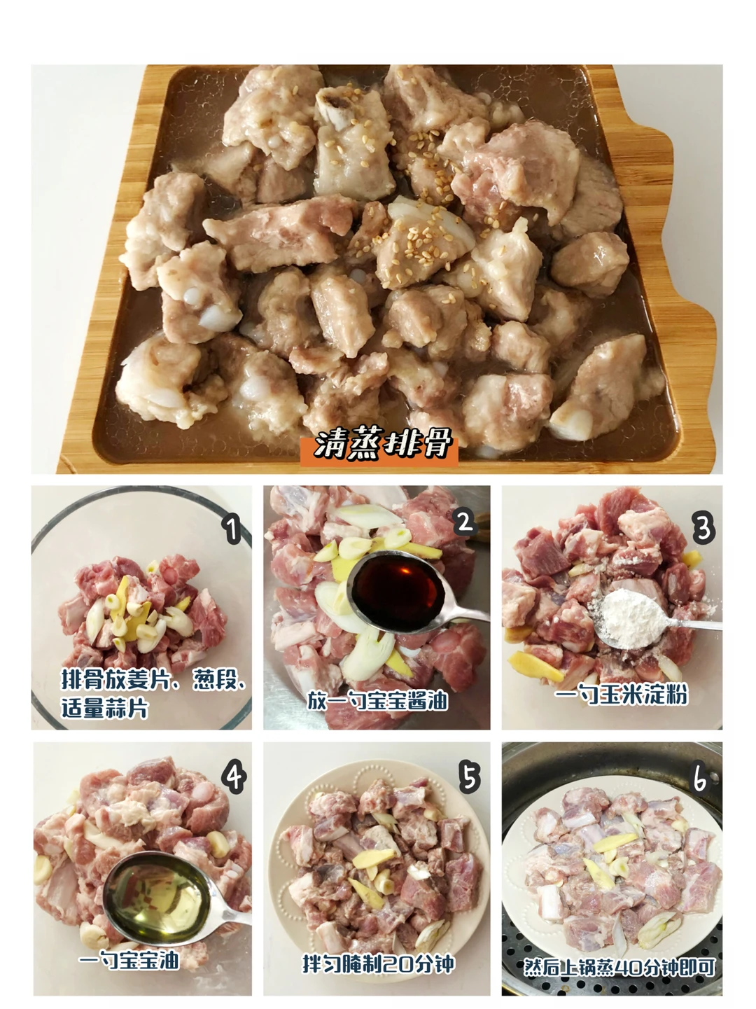 🔹放姜片、葱段、蒜片,一勺宝宝酱油,一勺玉米淀粉,一勺辅食油拌匀腌制20分钟。冷水上锅蒸40分钟即可。