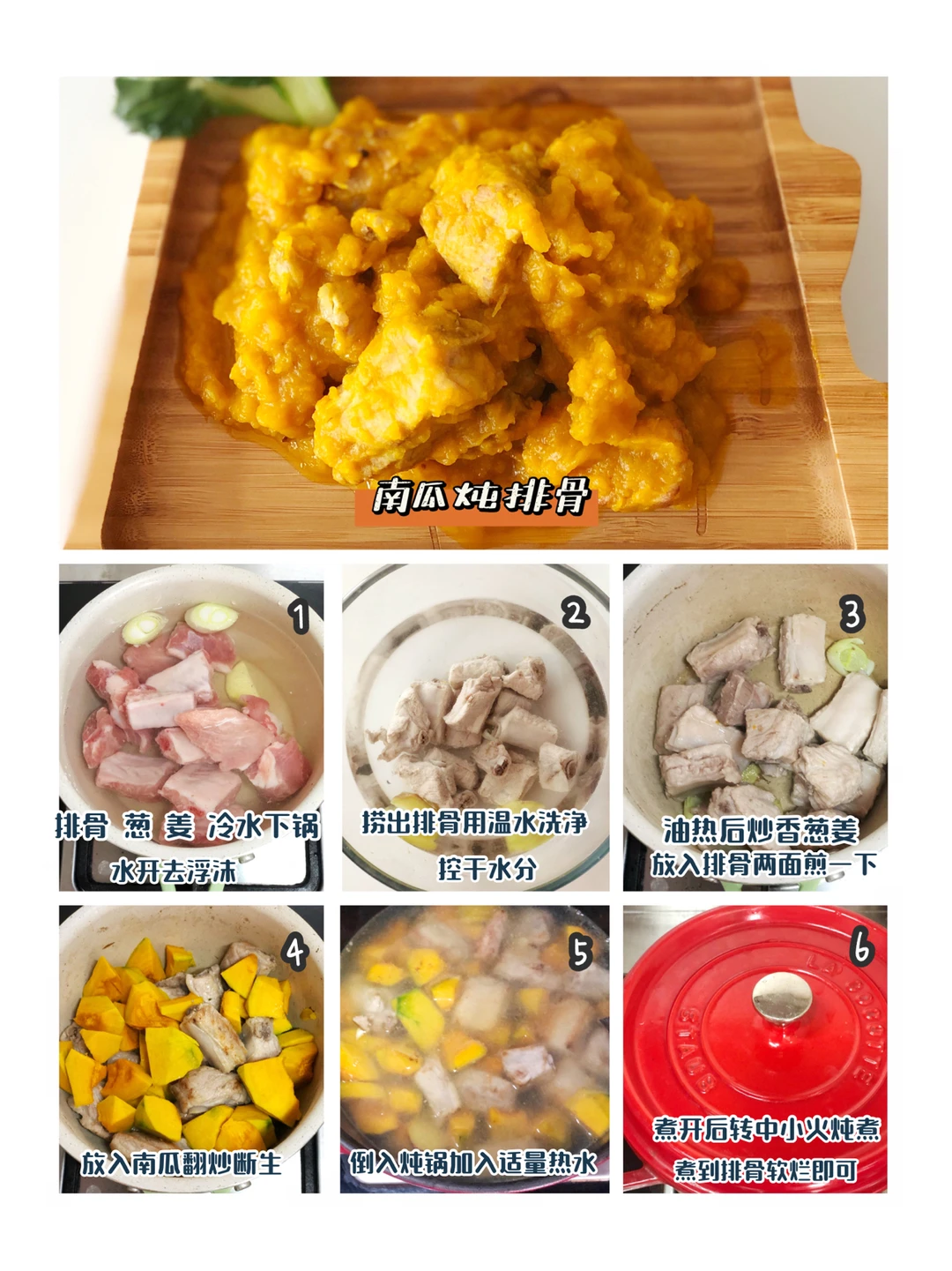 🔹排骨、葱、姜冷水下锅,水开去浮沫,捞出温水洗净。🔹另起一锅,油热后放入葱姜炒香,放入排骨翻炒一下,🔹再放入去皮的南瓜块翻炒断生,倒入末过食材的热水,煮开转小火,煮到排骨软烂即可。