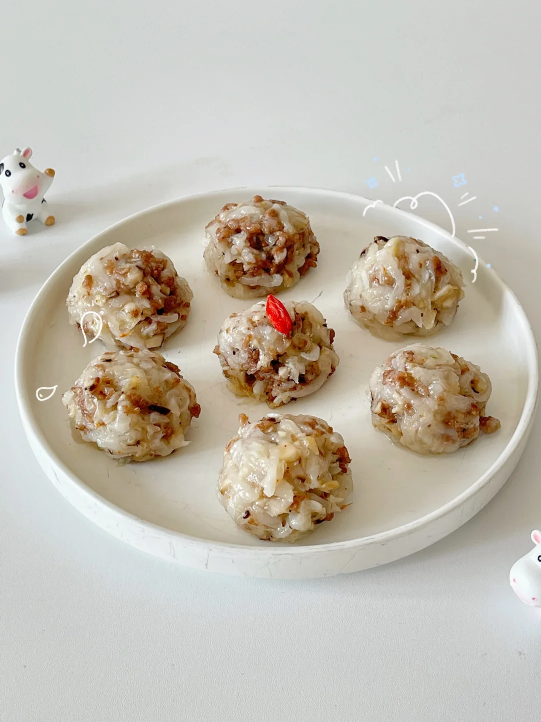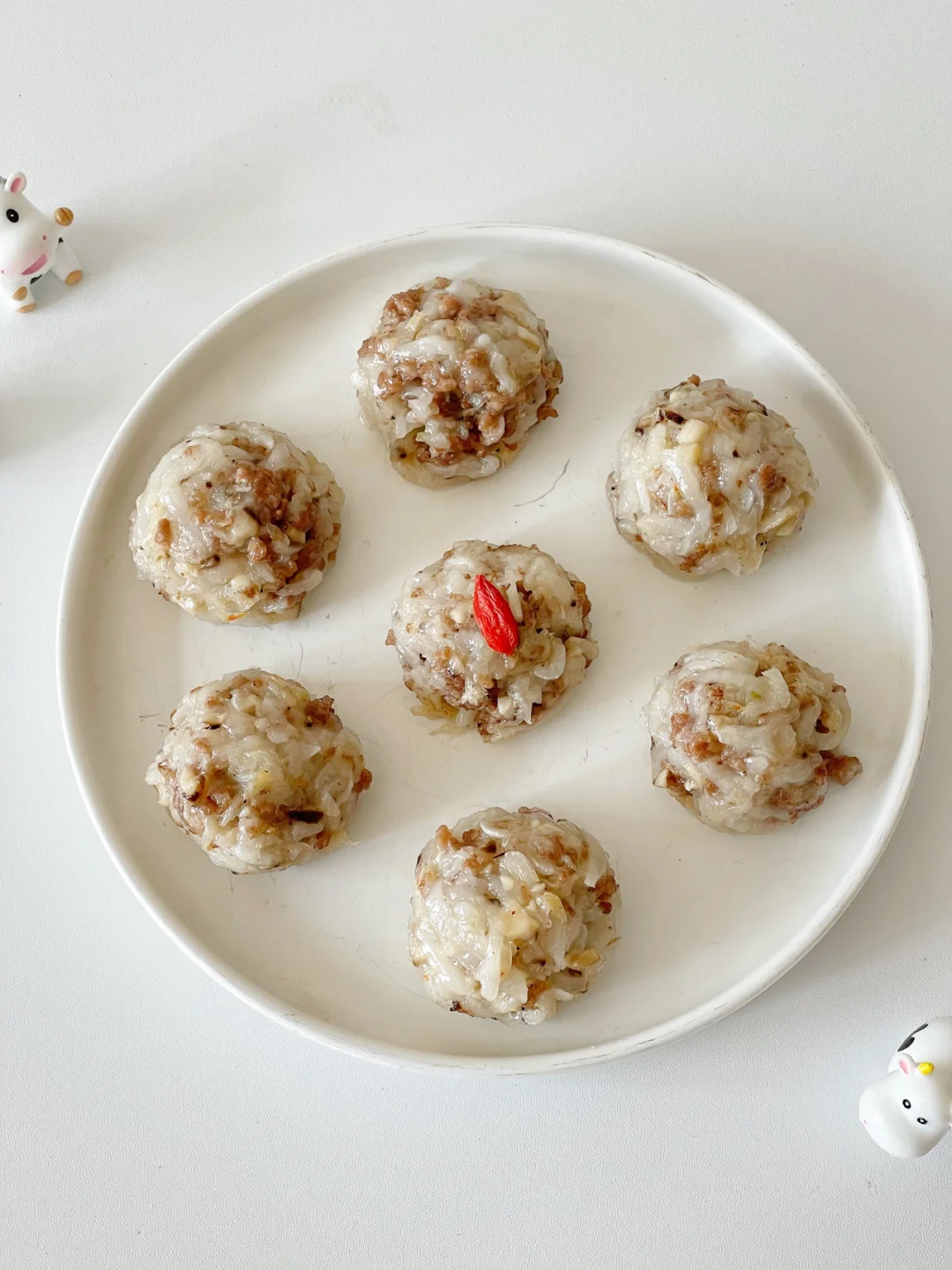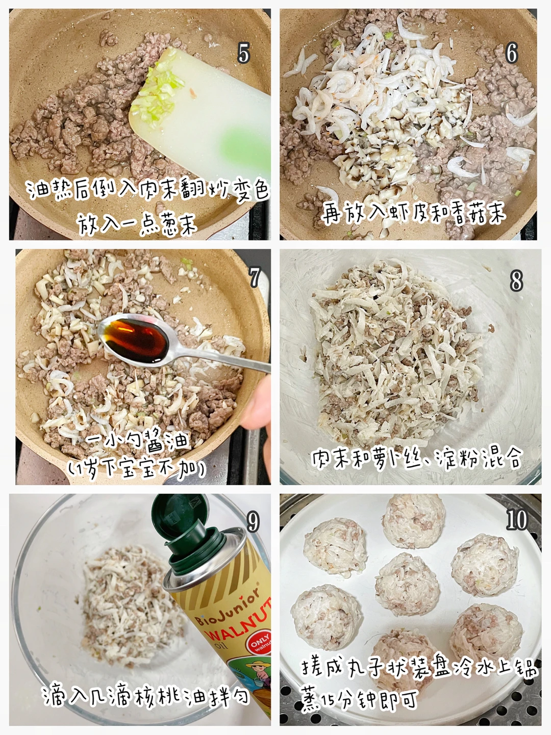 🔹炒好的肉末、白萝卜丝、淀粉混合,滴几滴核桃油拌匀,用手搓成丸子状装盘,冷水上锅蒸15分钟即可。