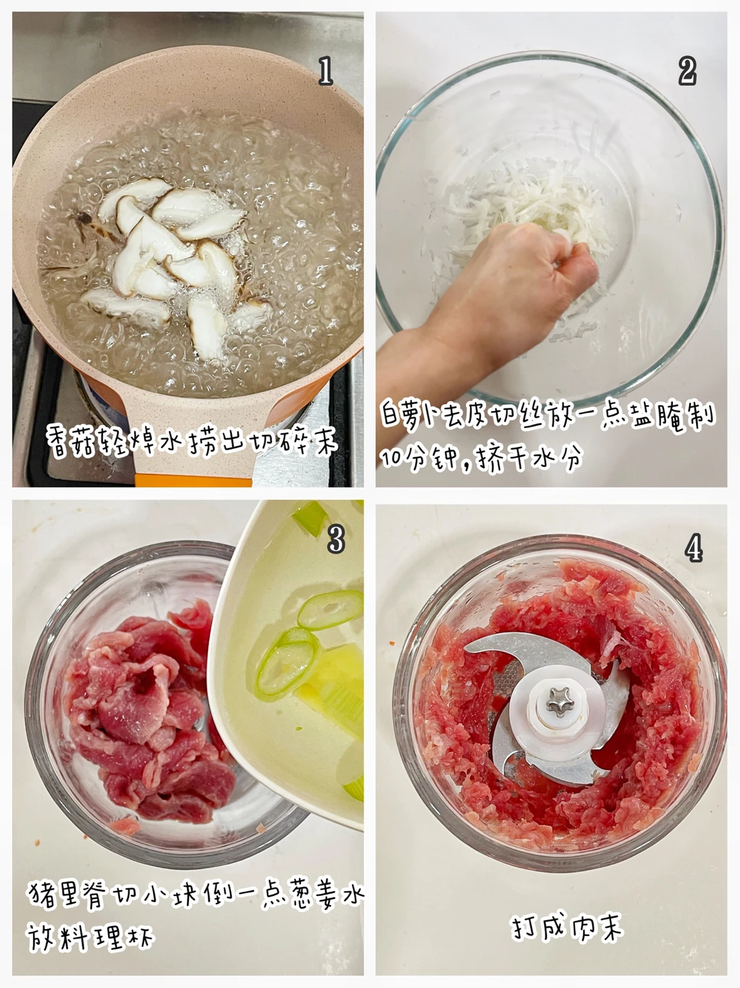 🔹猪里脊提前用姜片去腥,切小块放料理杯,倒入一点葱姜水打成肉末。