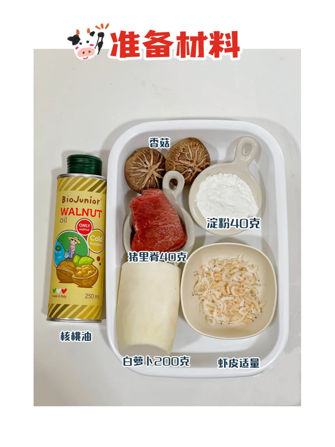 ✅准备材料:白萝卜200克、猪里脊40克、香菇适量、虾皮适量、淀粉40克,核桃油。