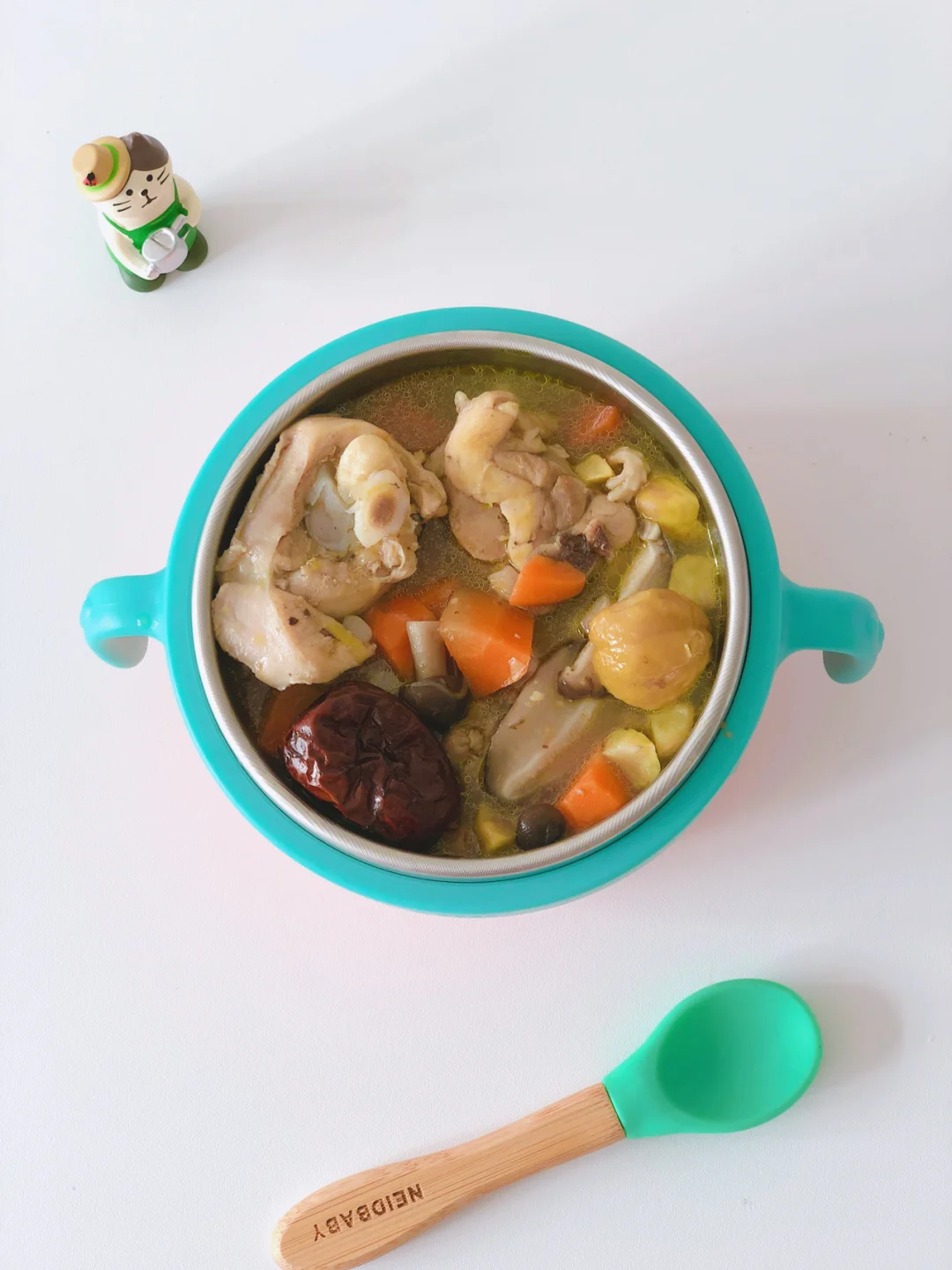 🎈另起一锅,倒入宝宝油,油热后放入葱和姜炒出香味,放入鸡腿块翻炒一下,再放入胡萝卜丁翻炒断生,放入菌菇翻炒一下,倒入莫过食材的热水,同时放入板栗和红枣,大火煮开,转小火炖煮20分钟,加一点盐拌匀。关火再滴入几滴亚麻籽油即可。