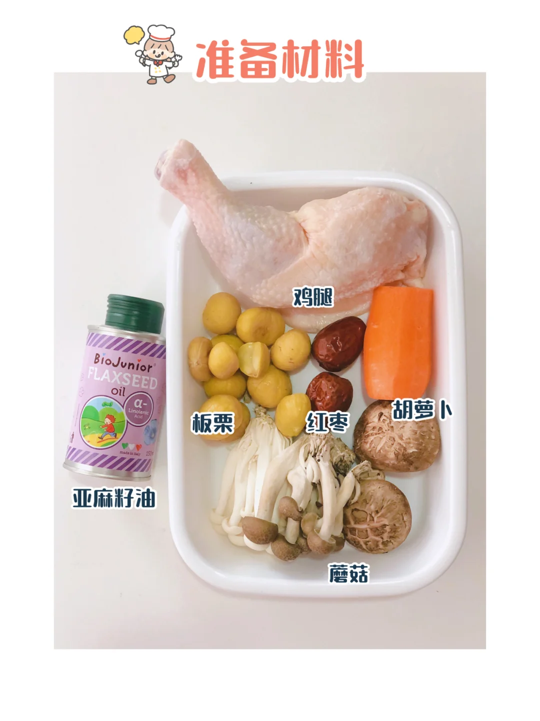 🎀准备材料:鸡腿、板栗、胡萝卜、菌菇、红枣、亚麻籽油