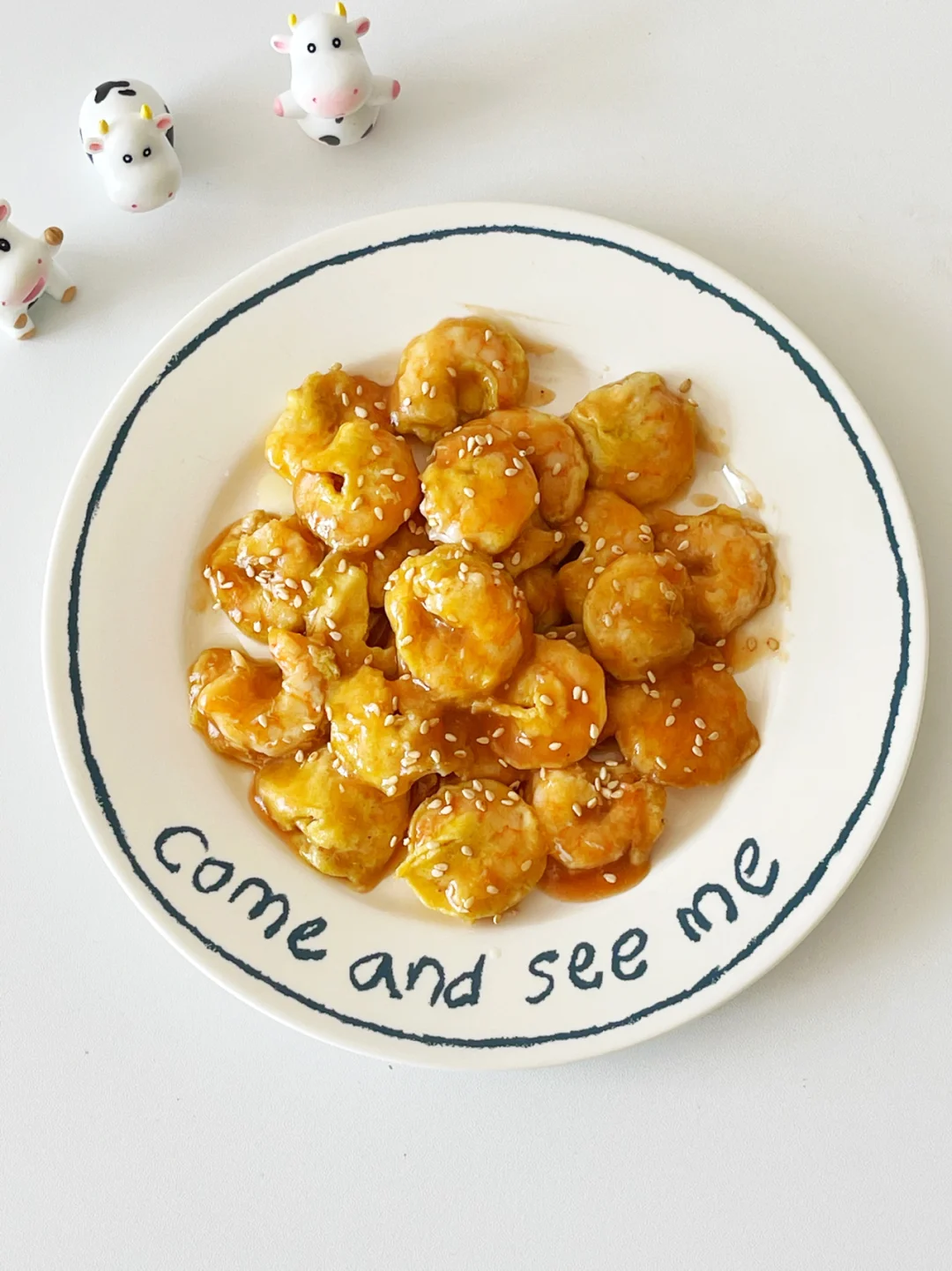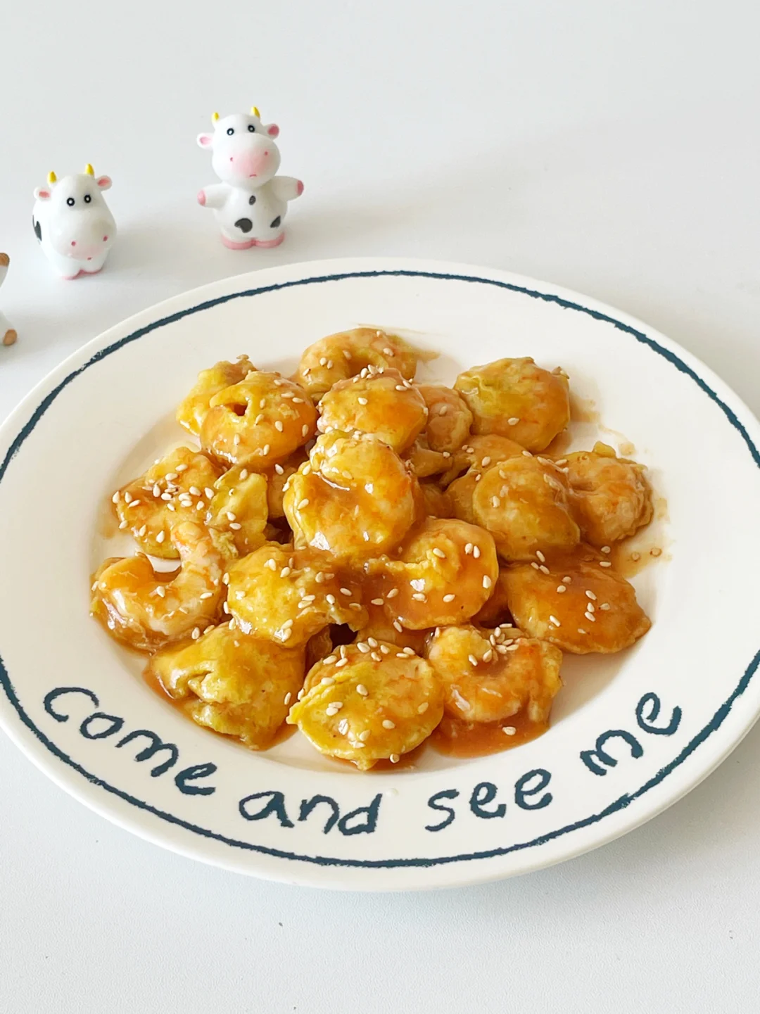 🔹把酱汁所需材料混合调拌匀,另起一锅,倒入酱汁,小火顺时针不停搅拌,搅拌到粘稠状,倒入虾仁,拌匀。