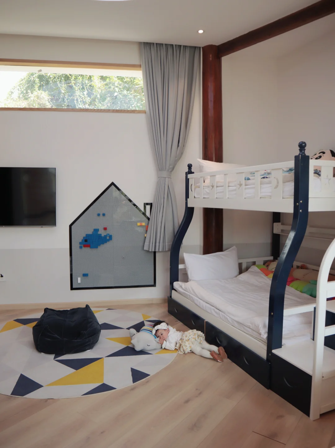 更惊喜的是拥有超大儿童房,上下铺,独立儿童卡通卫生间,还有整片乐高和粉笔墙,儿童摇摇椅和喝各种玩具也一应俱全,简直就是小朋友的天堂。