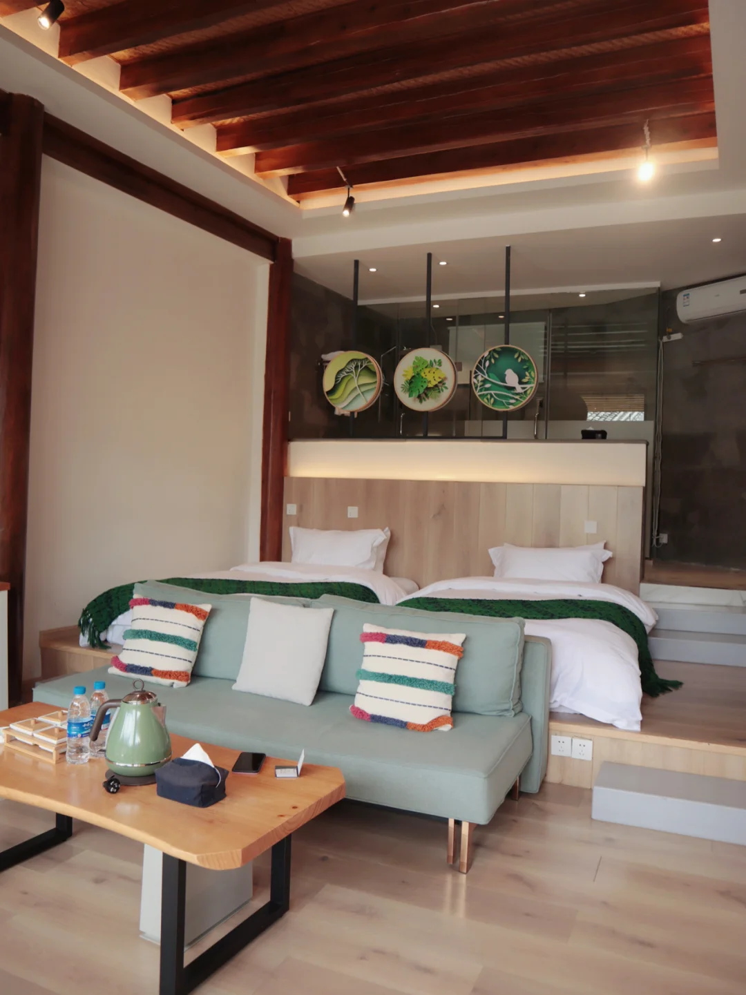 民宿坐落于野鸭湖畔,旁边就是陷河湿地,交通便利,观景极 佳。民宿上面楼层直接是全景观温泉房。由于带着小宝宝,店家直接推 荐的是房型是奢华庭院温泉泡池亲子套房。房间不仅带独立私汤,温泉水源自于荷花温泉。