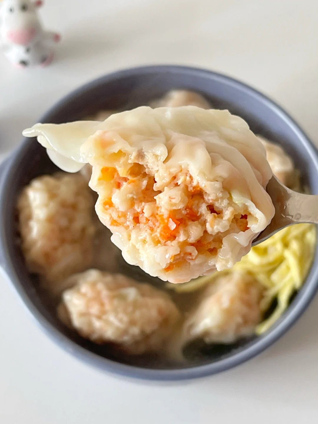 不知道给宝宝做什么吃的时候,就做今天这款鲜虾馄饨准没错,味道鲜美,有肉、有虾、有汤、有面儿,吃的那叫一个舒服。而且用的是最简单的馄饨包法,一包就会哦[斜眼R]