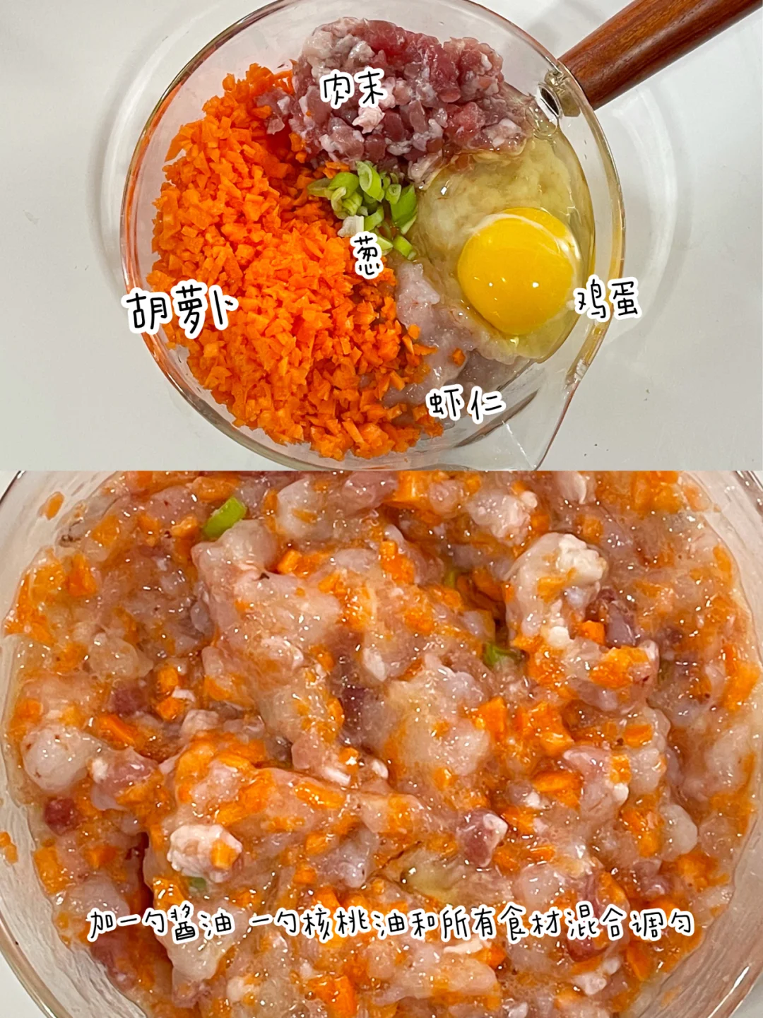 🔹猪肉放料理机打成肉末,胡萝卜切碎丁,虾仁切小段,葱切小丁。把所有的食材加一个鸡蛋、一勺酱油,再加一勺核桃油会更香哦,顺时针搅拌均匀,馅儿料就调好了.