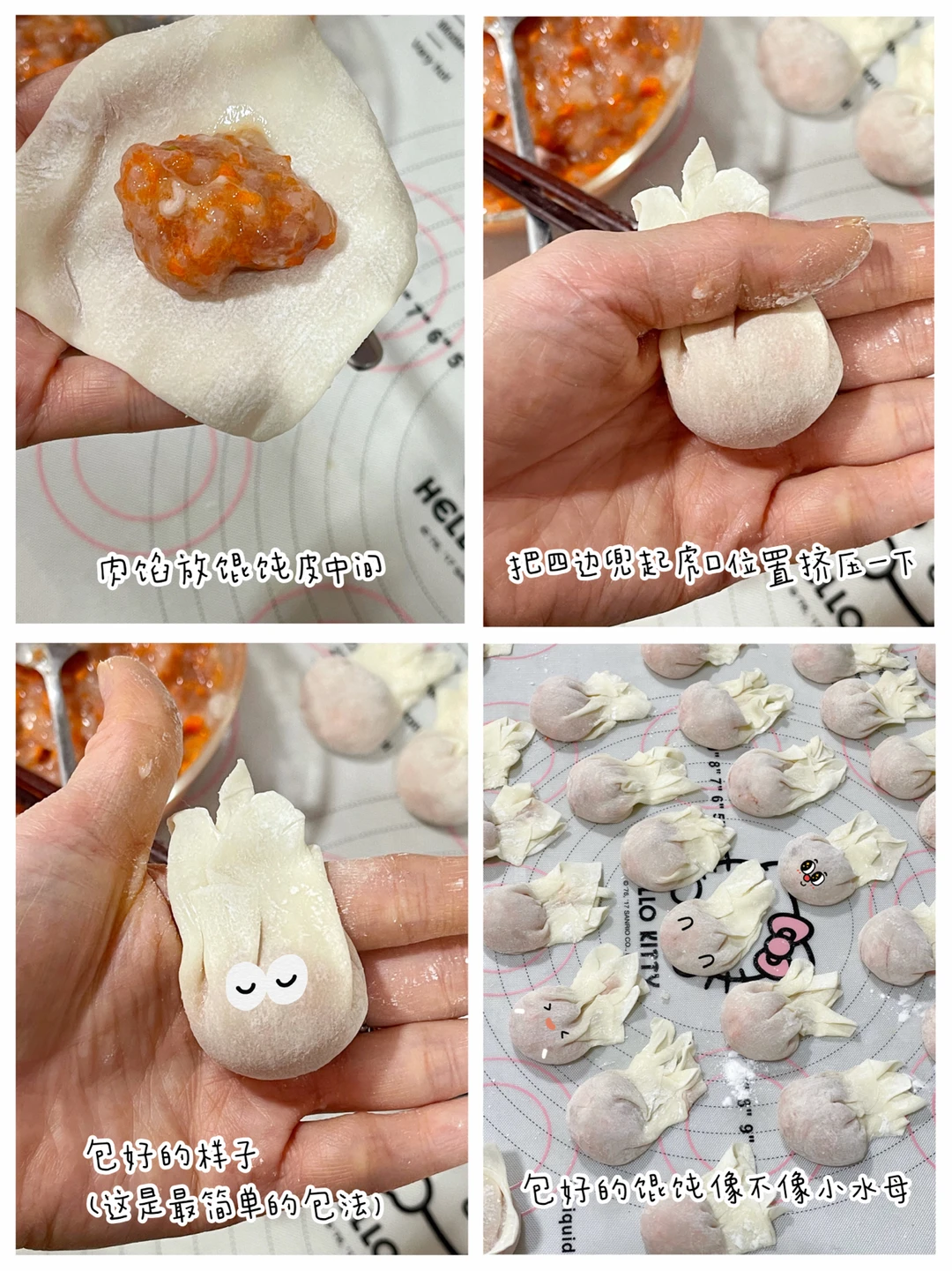 🔹包法:把馅料放馄饨皮中间,馄饨皮四周兜起,用虎口位置夹住馅料位置按压一下。如图一看就会。
