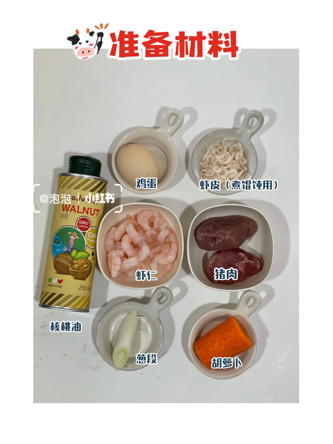 ✅馄饨馅准备材料:猪肉、虾仁、胡萝卜、鸡蛋、葱、核桃油、酱油。