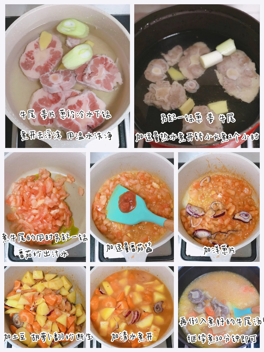 🎈番茄浓汤做法:油热后放入葱末炒香,放入番茄炒出汁水、可加一点宝宝番茄酱,放入洋葱片炒几下,再同时放入土豆和胡萝卜翻炒断生,加入末过食材的清水煮开后放入牛尾汤里。