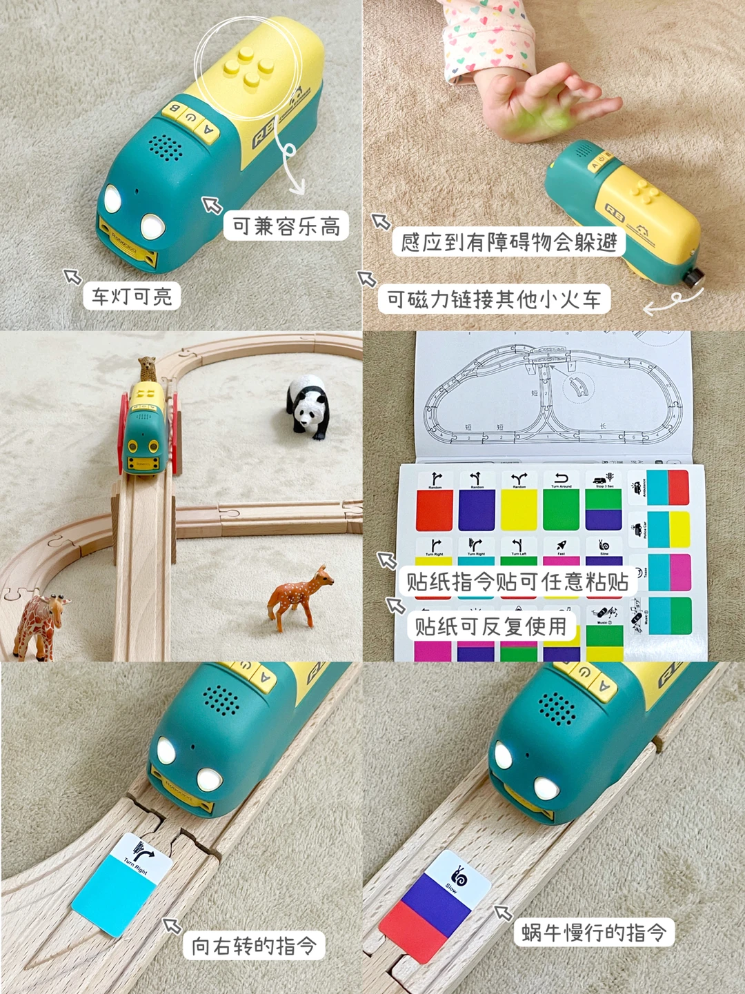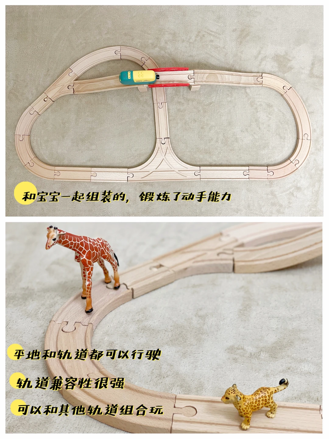 🔹榉木材质的轨道,我和宝宝一起动手搭建的,搭好后宝宝超有成就感,配有19种指令贴纸,可任意选择贴在轨道上,轨道车感应到就会执行相应的指令,比如:加速、蜗牛慢行、向右转、播放音乐等等。而且它的兼容性很高,市面上一些主流的轨道都可以组合一起玩,还可兼容乐高哦。