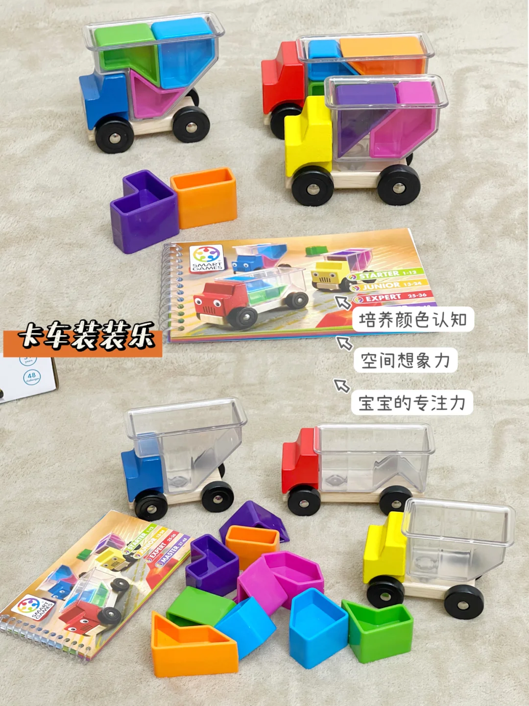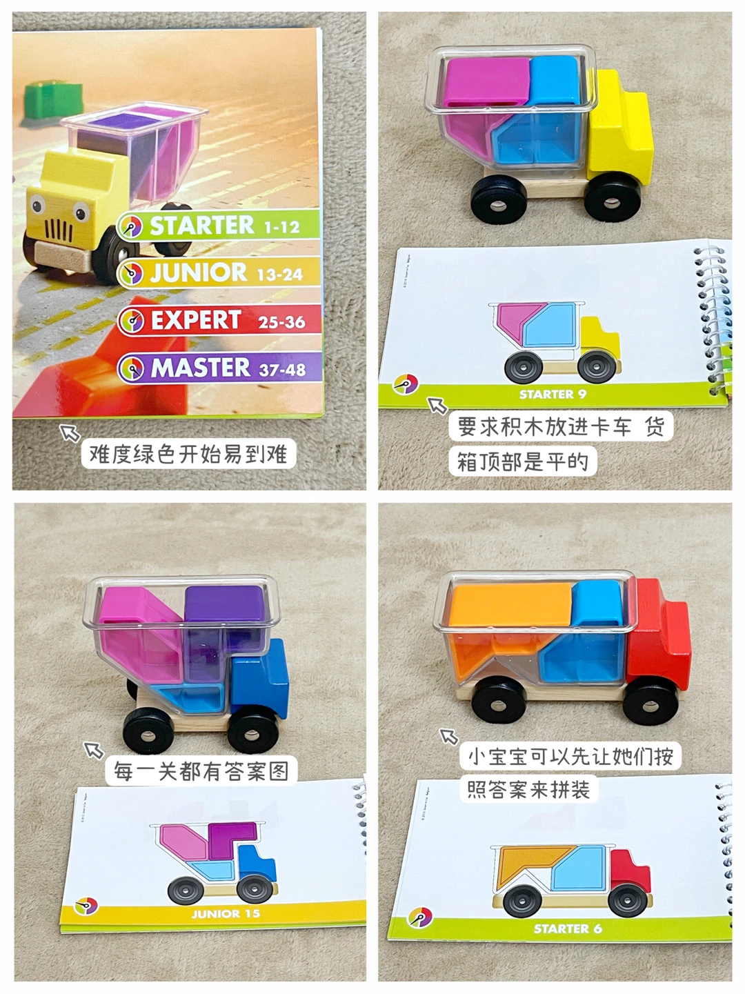 🔹这款玩具一开封,我家两小只就被颜色亮丽的积木,还有可爱的车车所吸引(车车已不再光是男孩子的专利了[偷笑R])有48个关卡,由易到难,小宝宝先不用要求按照图卡来,可任由她们发挥.