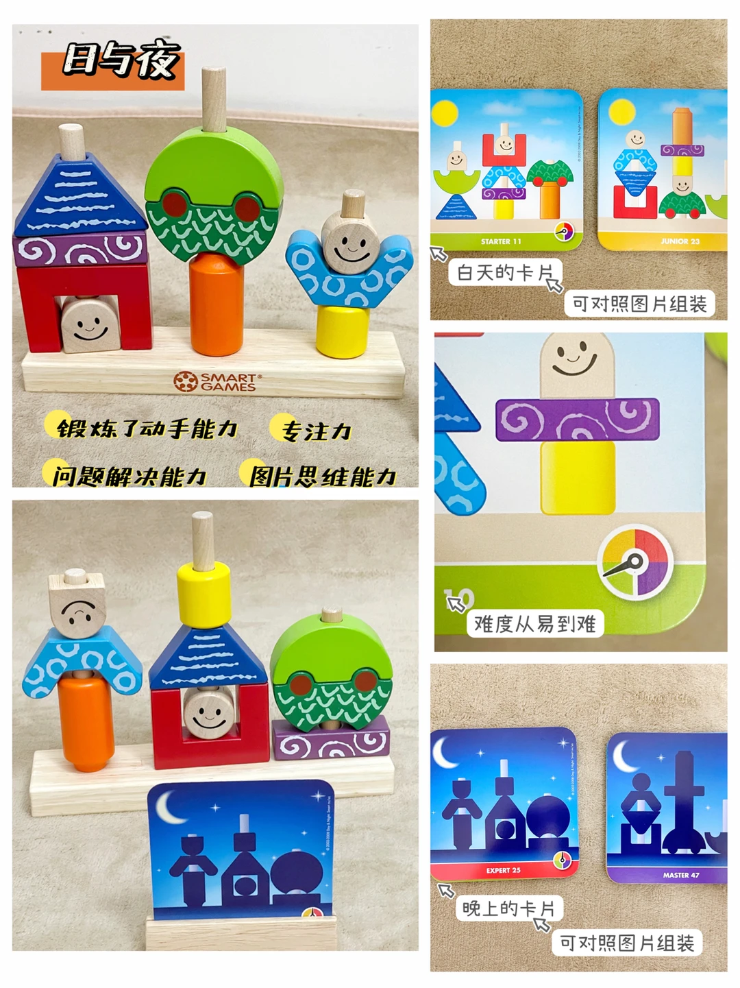 🔹10块木质积木,日与夜各24张关卡的一个组合。玩法很多种。小月龄宝宝可以任意搭建,可以锻炼宝宝的动手能力,大一点的宝宝可以根据图卡来组建,搭建完了还可以鼓励宝宝编一个小故事,可以很好锻炼宝宝的语言能力