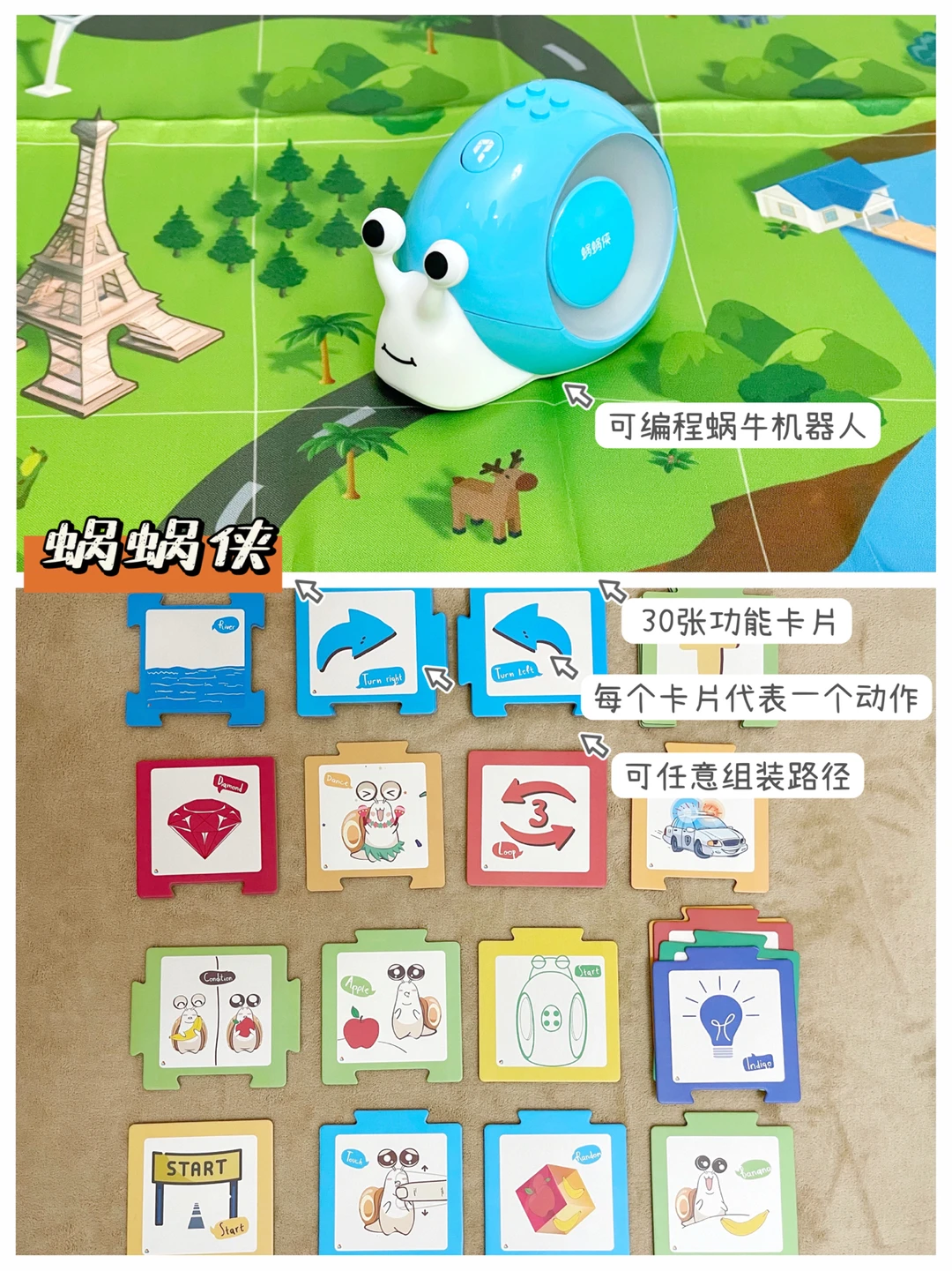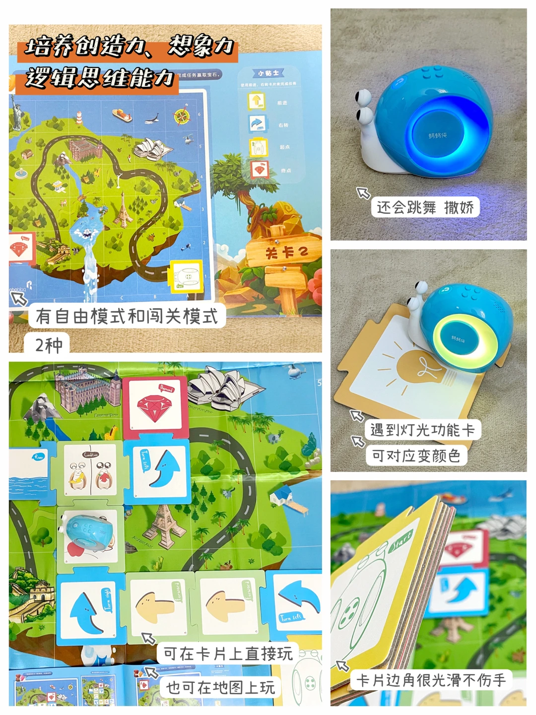 🔹可爱的蜗牛造型,可搭配30张功能卡片玩出很多花样哦。每个功能卡片都代表一个动作,比如有右转,直行,灯变色,警车响,可任意组合来设计成路径,蜗牛根据路径就可以走出不一样的它啦,可以在卡片上玩,也可以在地图上用自由模式来玩。