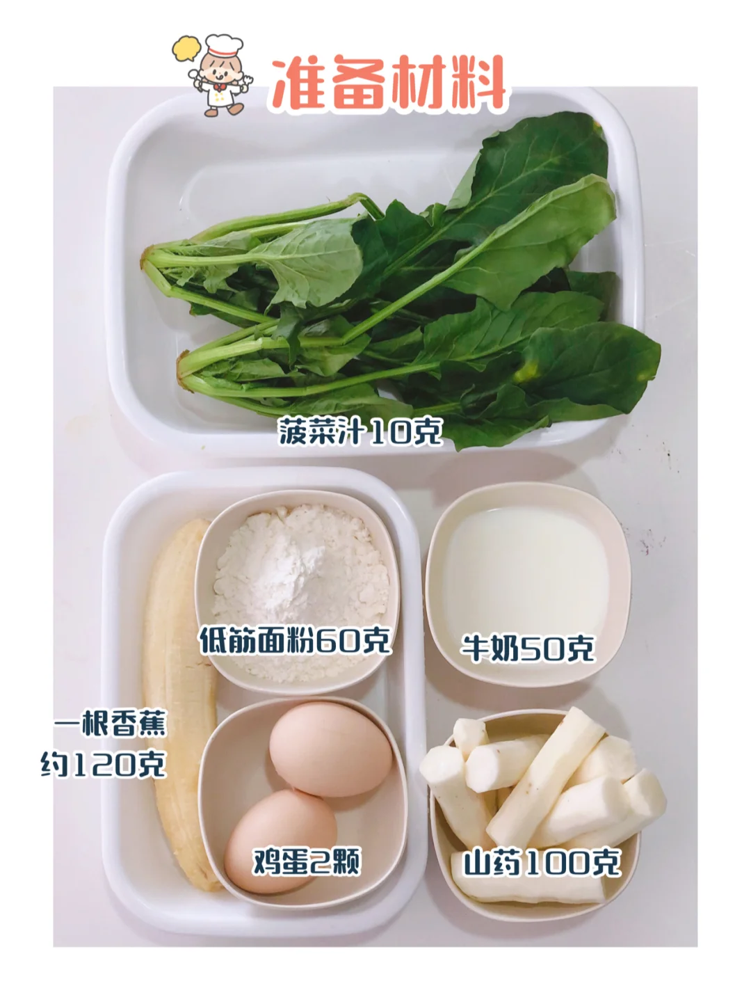 🌟准备材料:香蕉一根(约120克),低筋面粉60克,鸡蛋2颗,牛奶50克(配方奶也可),山药100克,菠菜汁10克。